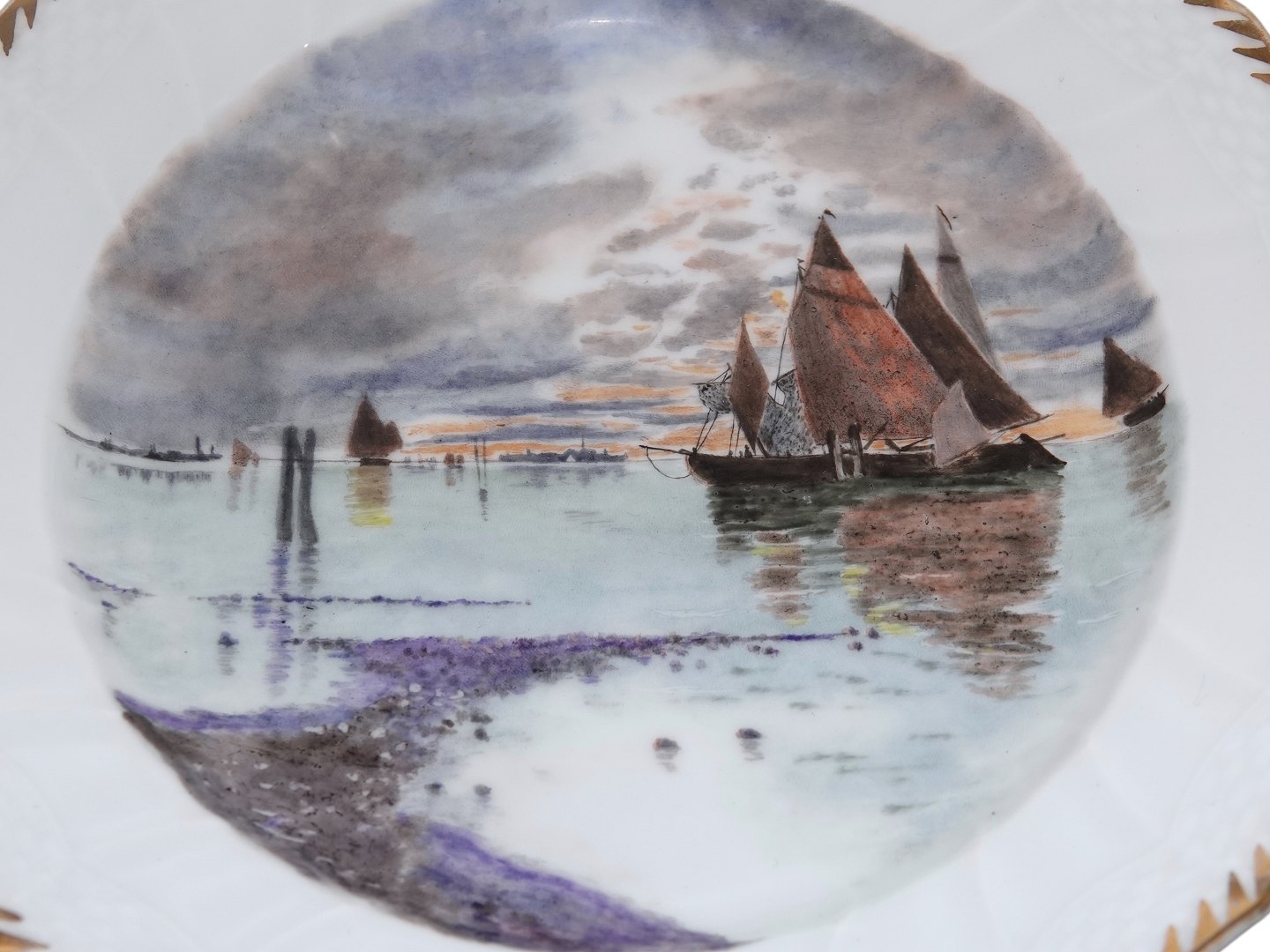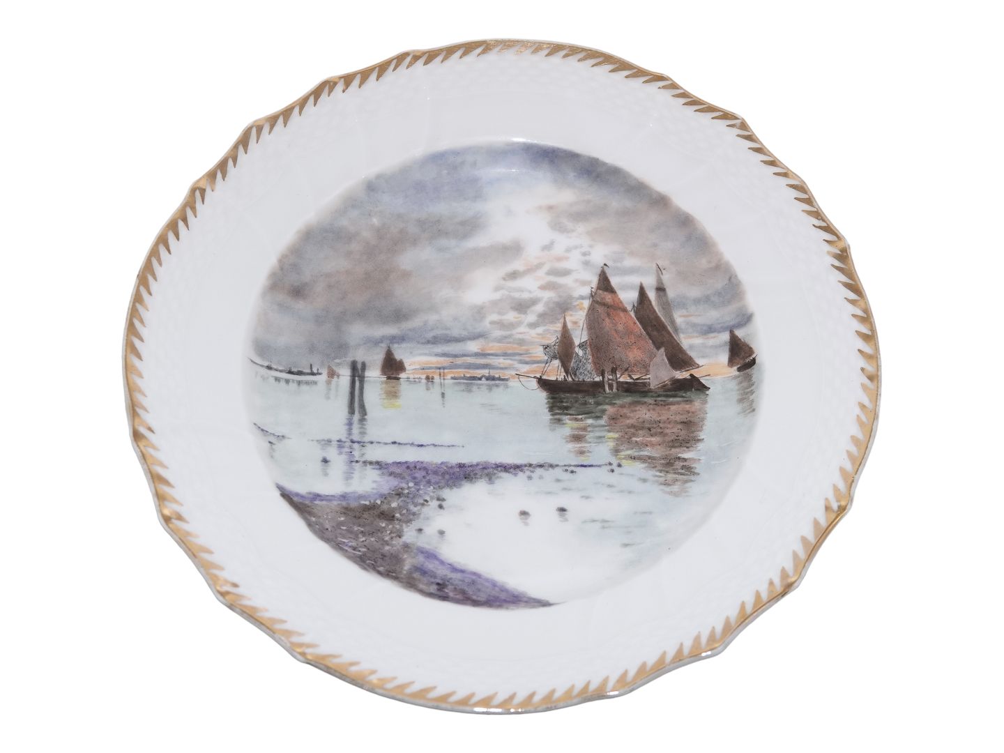 Royal Copenhagen Hvid Svejfet med takket guldkant, frokosttallerken dekoreret med skibe.
