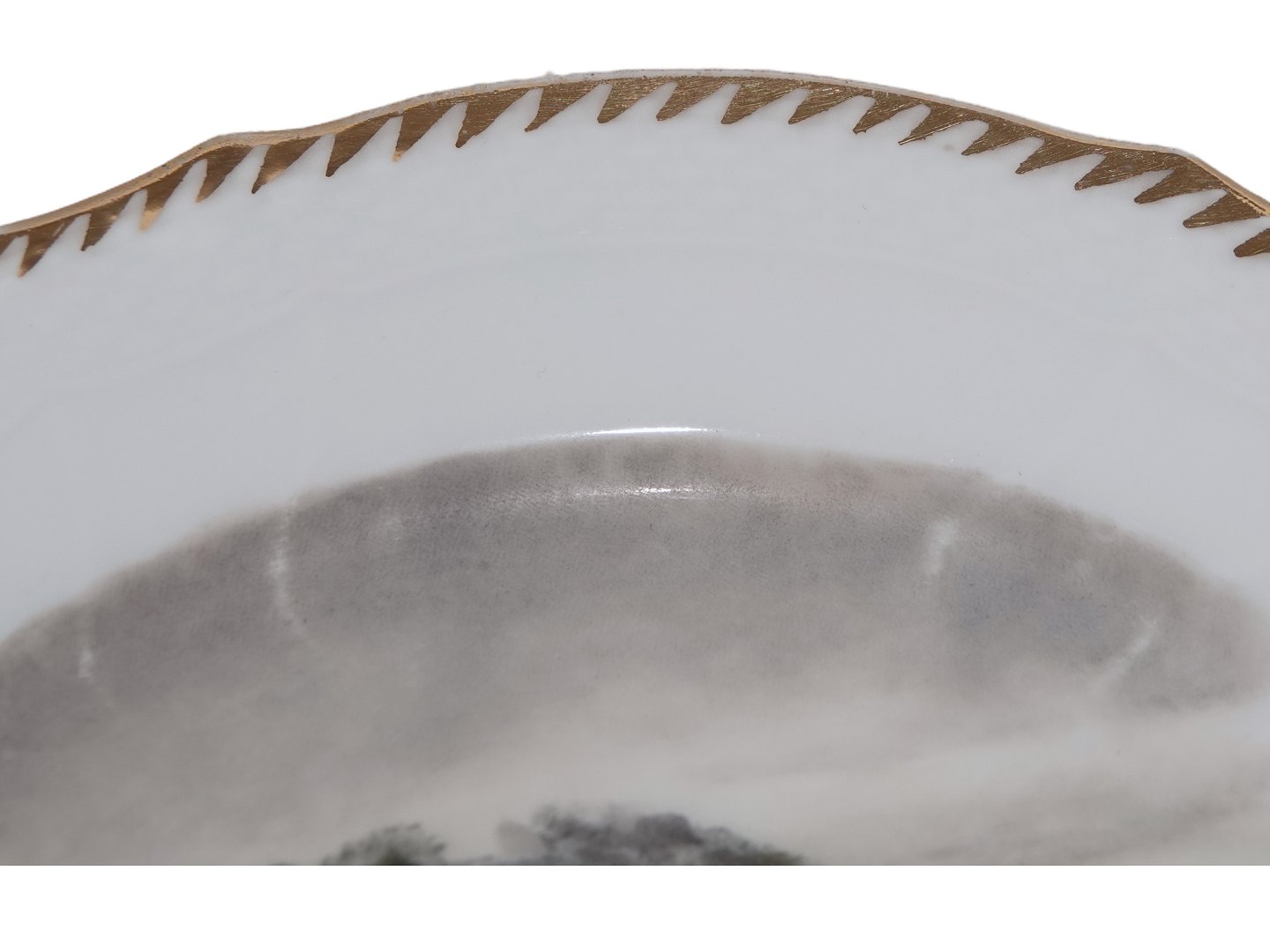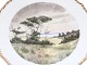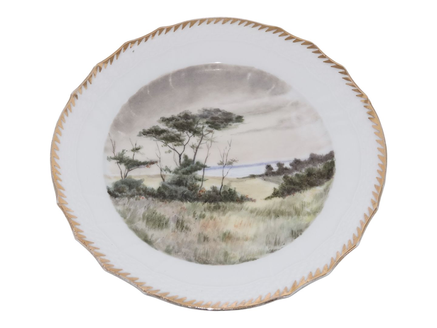 Royal Copenhagen Hvid Svejfet med takket guldkant, frokosttallerken dekoreret med landskab.