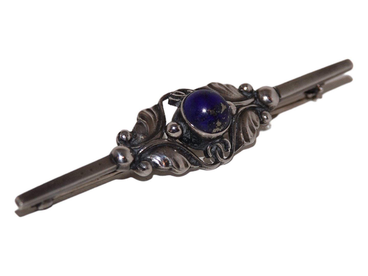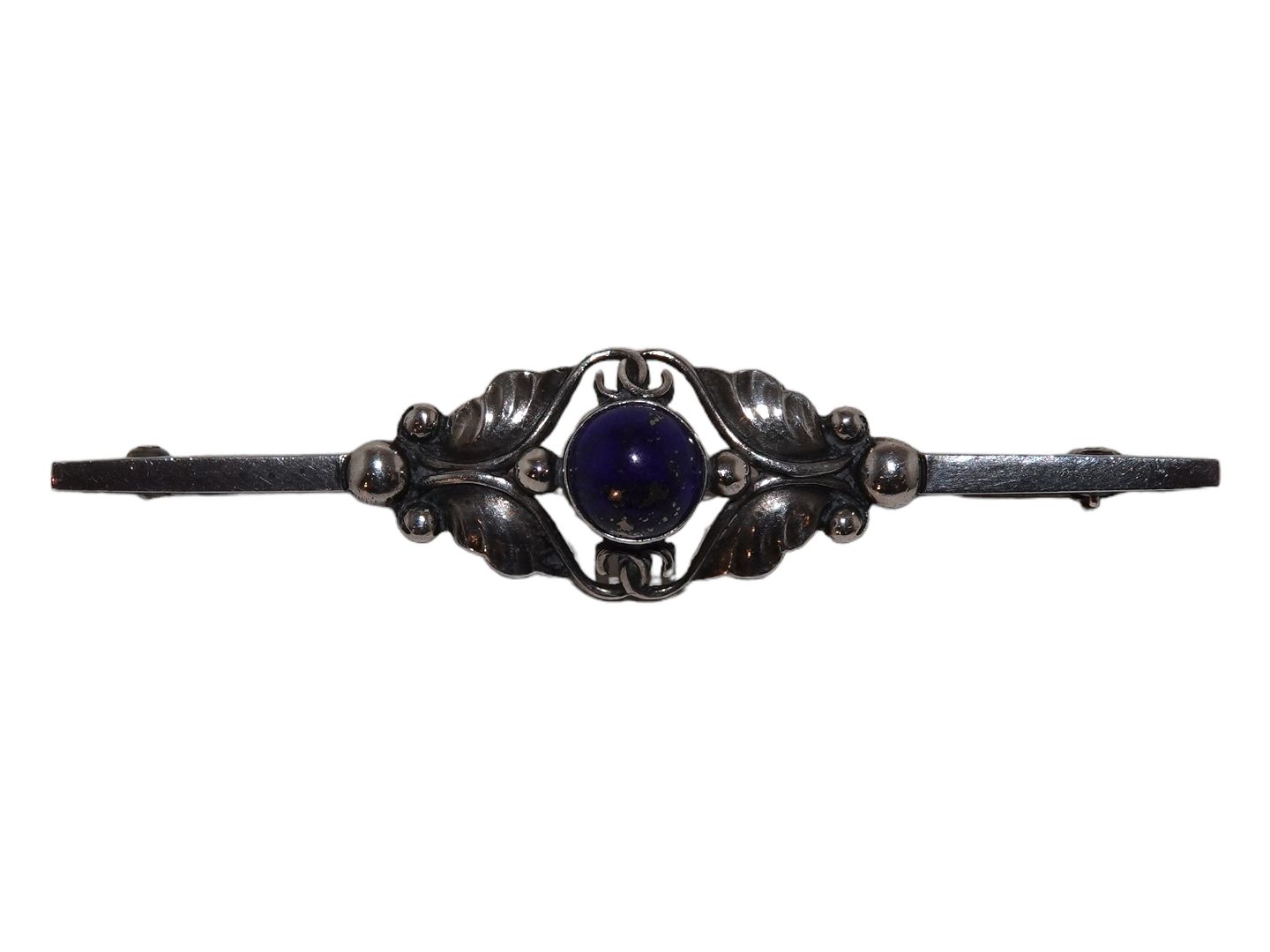 Georg Jensen sterlingsølv, broche med lapis lazuli (mørkeblå sten). Dessinnummer 224B. Denne er produceret efter 1945. Længde 6,2 cm. Perfekt stand.