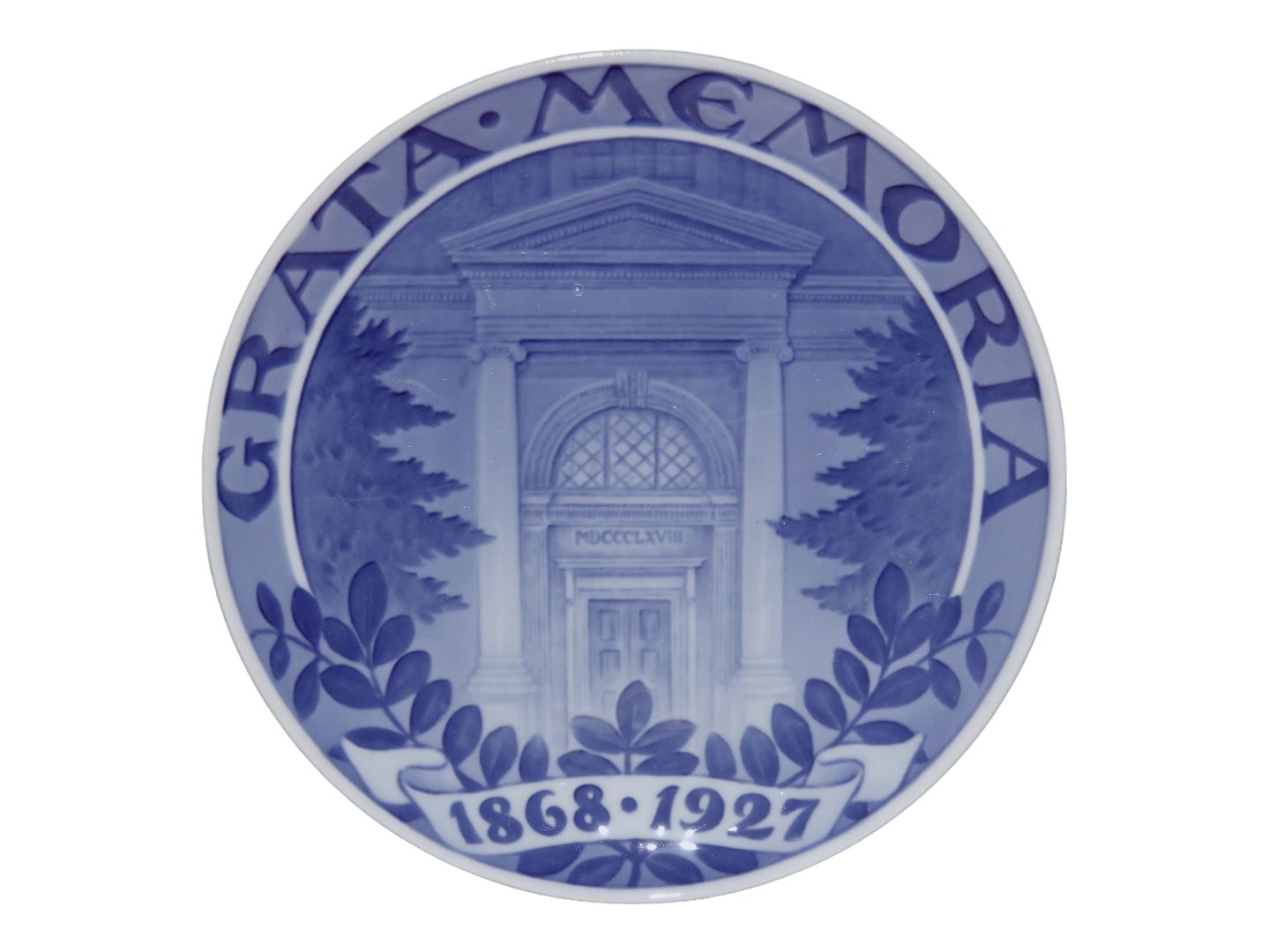 Royal Copenhagen Mindeplatte fra 1927. Grata Memoria 1868-1927 (En kær erindring), dekoreret med indgangen til Frimurerlogen i Klerkegade.