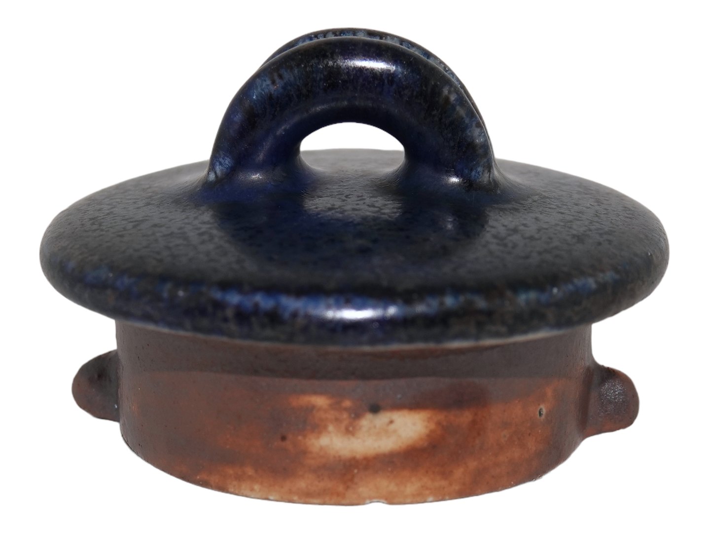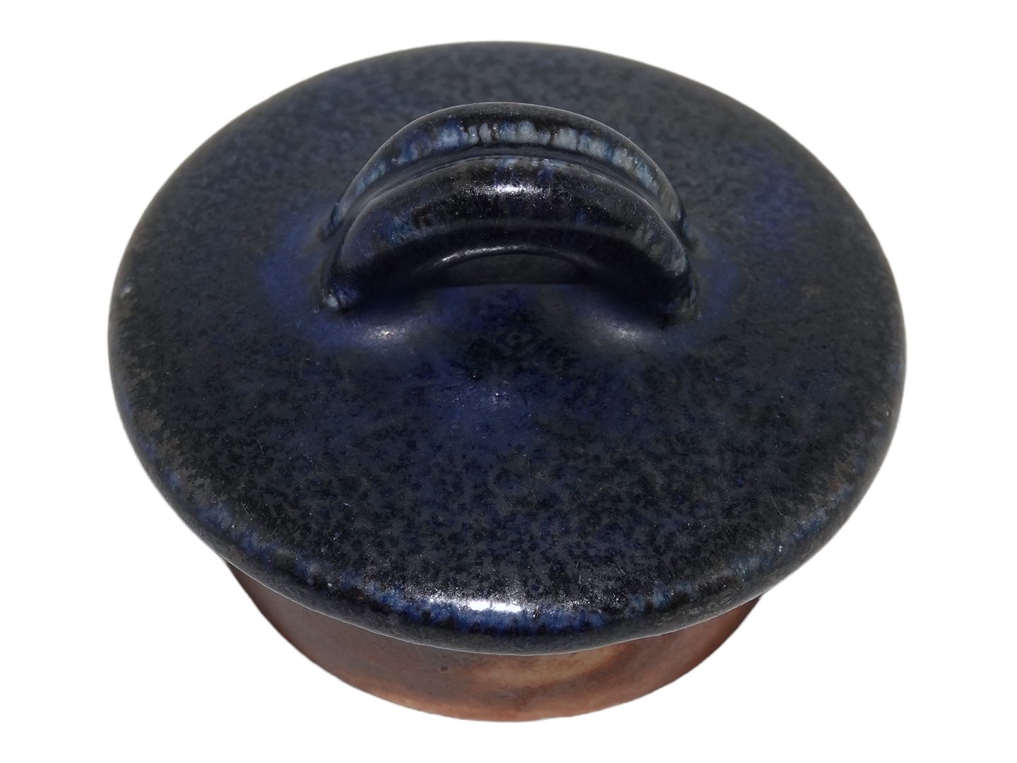Saxbo keramik, blåt låg. Indvendig diameter 5,0 cm. Der er flere små skår på indersiden af låget, se fotos. De vil ikke kunne ses når låget er på.