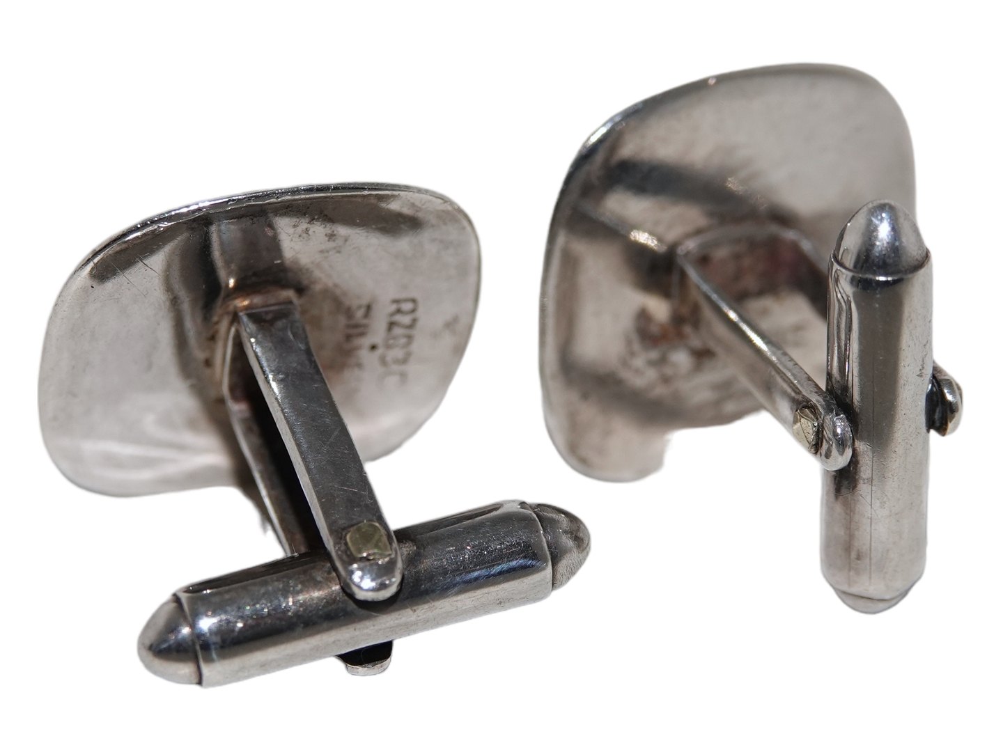 Par manchetknapper i sølv med sort dekoration. Stemplet "RZ 830 SILVER". Selve manchetten måler 2,0 cm. x 2,0 cm. Velholdt stand.
