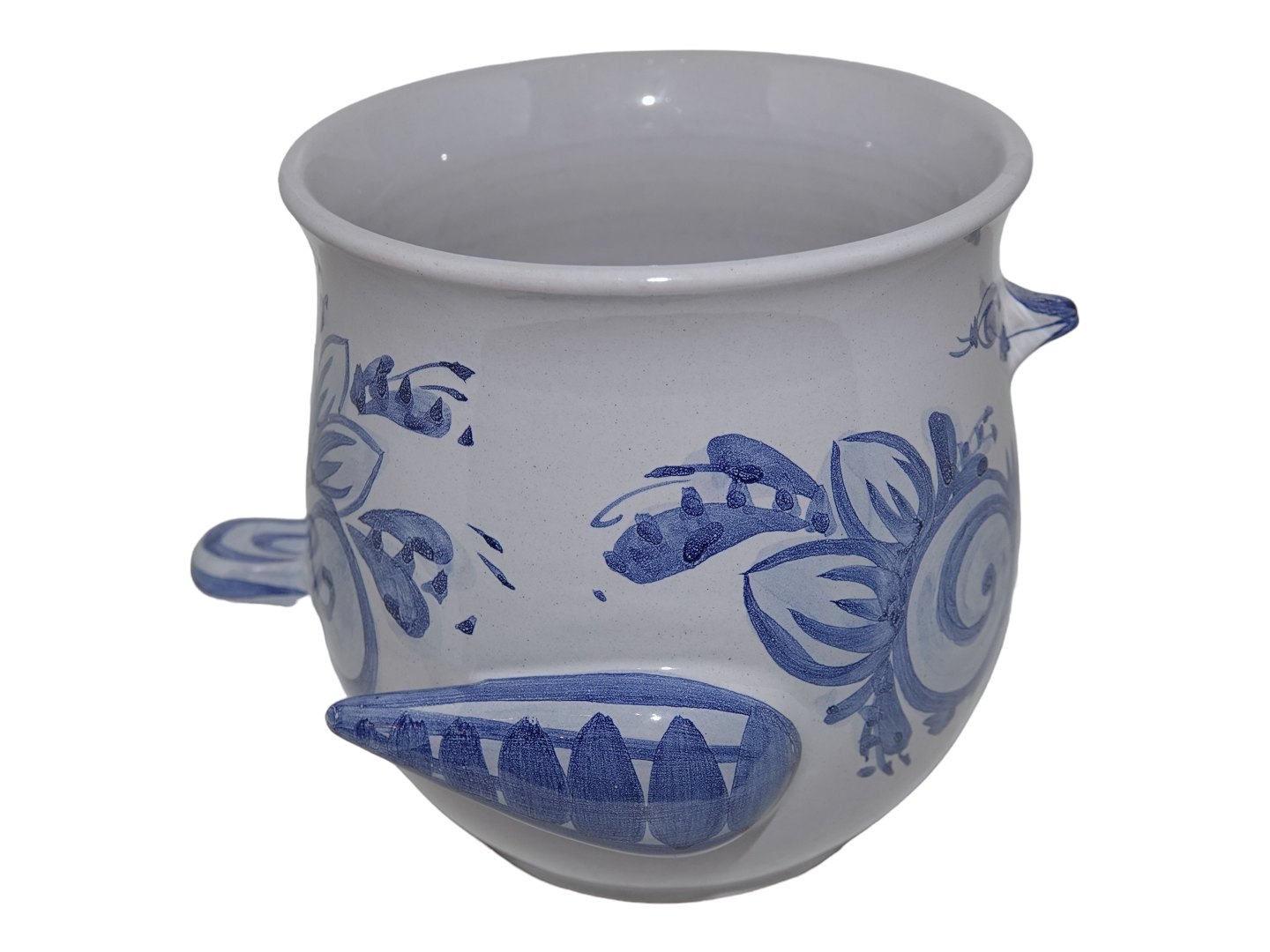 Bjorn Wiinblad art pottery, large flower pot shaped as a bird with beak, wings and a tail. Decoration number V67. This is from 1986. Height 14.1 cm., diameter 14.7 cm. Perfect condition.