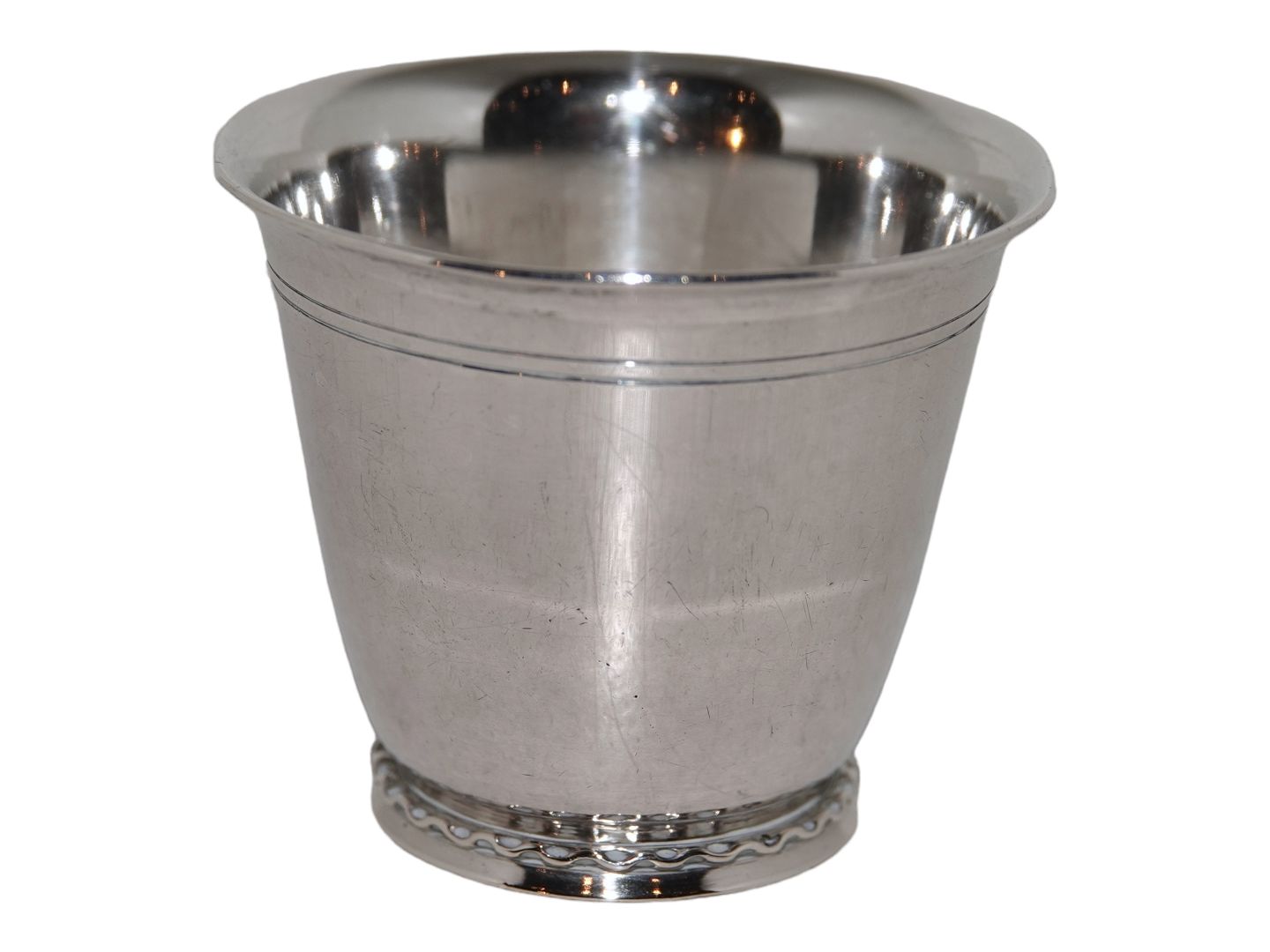 Just Andersen sølv, lille bæger. Designnummer 106 og stemplet "830S". Højde 4,0 cm., diameter 5,0 cm. Velholdt stand uden indgraveringer.