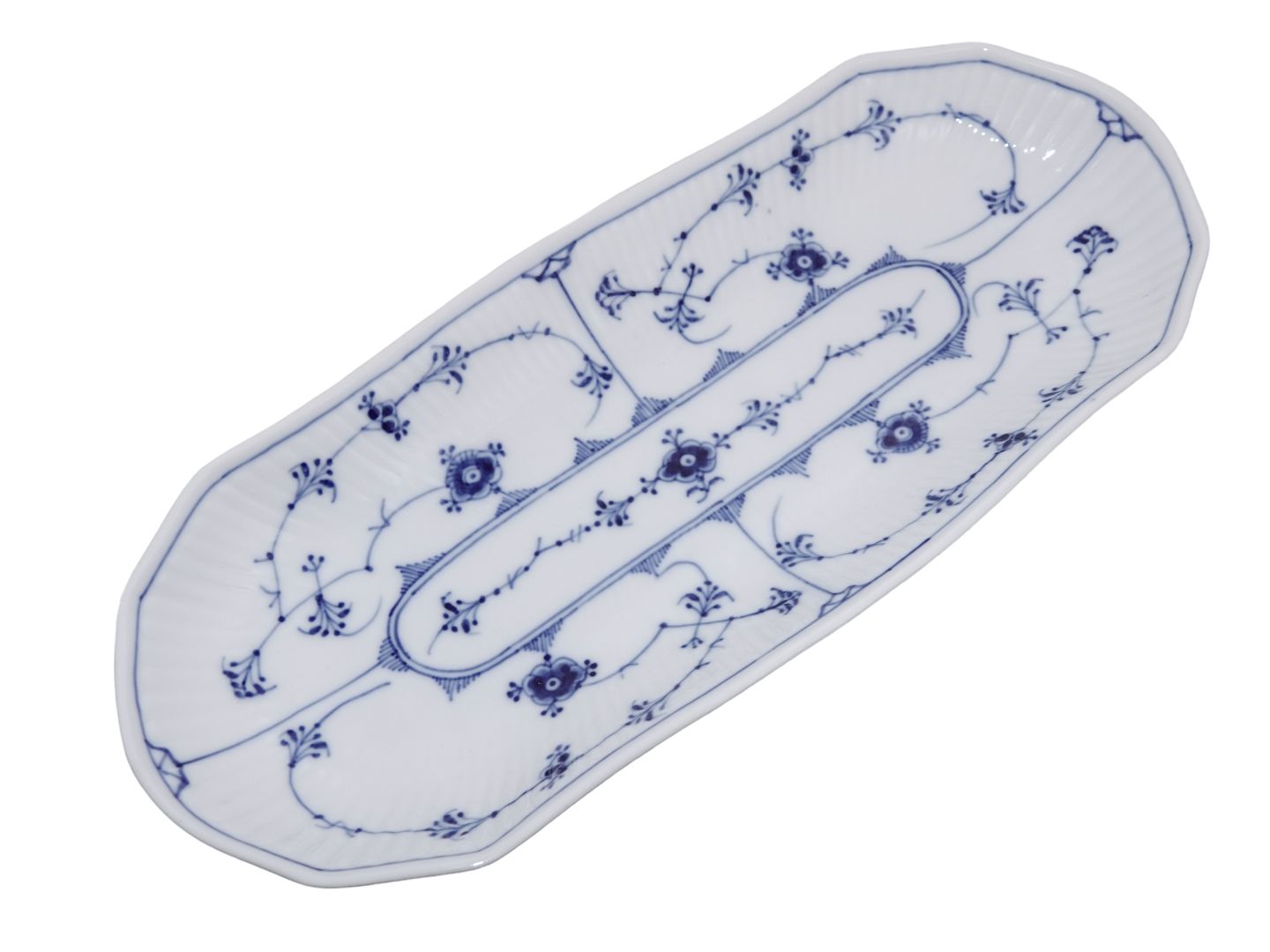 Royal Copenhagen Musselmalet Riflet, langt sellerifad. Af fabriksmærket ses det, at denne er produceret i mellem 1898 og 1923. Dekorationsnummer 1/297. 2. sortering. Længde 36,7 cm. Perfekt stand uden fejl.
