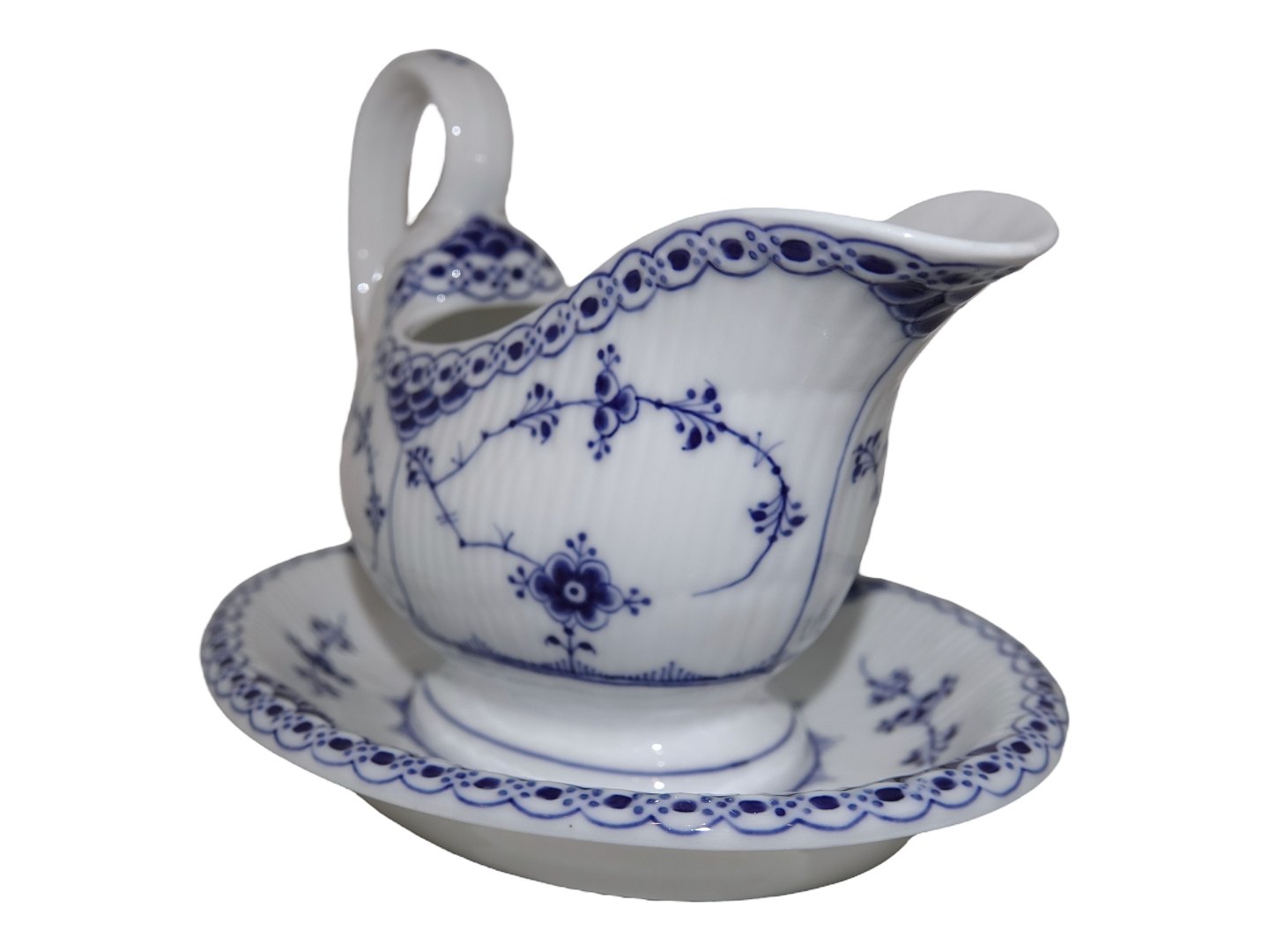 Royal Copenhagen Musselmalet Halvblonde, sovseskål på fast fod. Af fabriksmærket ses det, at denne er produceret mellem 1894 og 1897. Dekorationsnummer 1/584. 1. sortering. Længde 21,0 cm. Perfekt stand uden fejl.