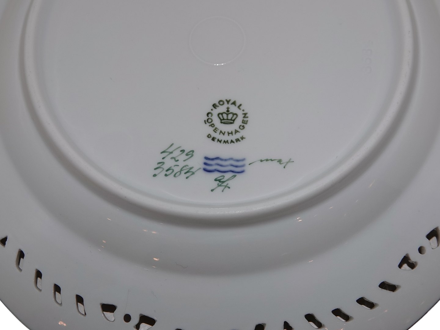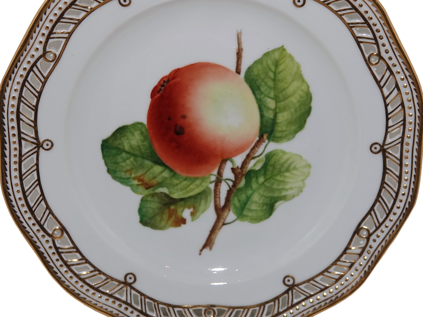 Royal Copenhagen Flora Danica, frugttallerken dekoreret med et æble. Dekorationsnummer 429/3584. Fabriksmærket viser, at denne er produceret i 1963. 1. sortering. Diameter 22,0 cm. Perfekt stand uden fejl.