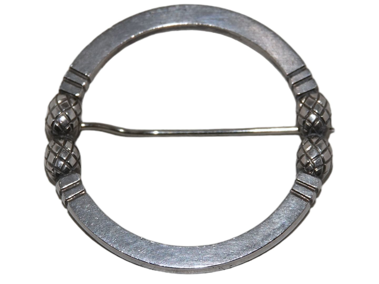 Georg Jensen sterlingsølv, broche med Konge mønster. Designnnummer 253. Designet af Johan Rohde i 1915. Denne er produceret efter 1945. Diameter 3,7 cm. Nålen bagpå er bukket lidt, se fotos, ellers perfekt stand.