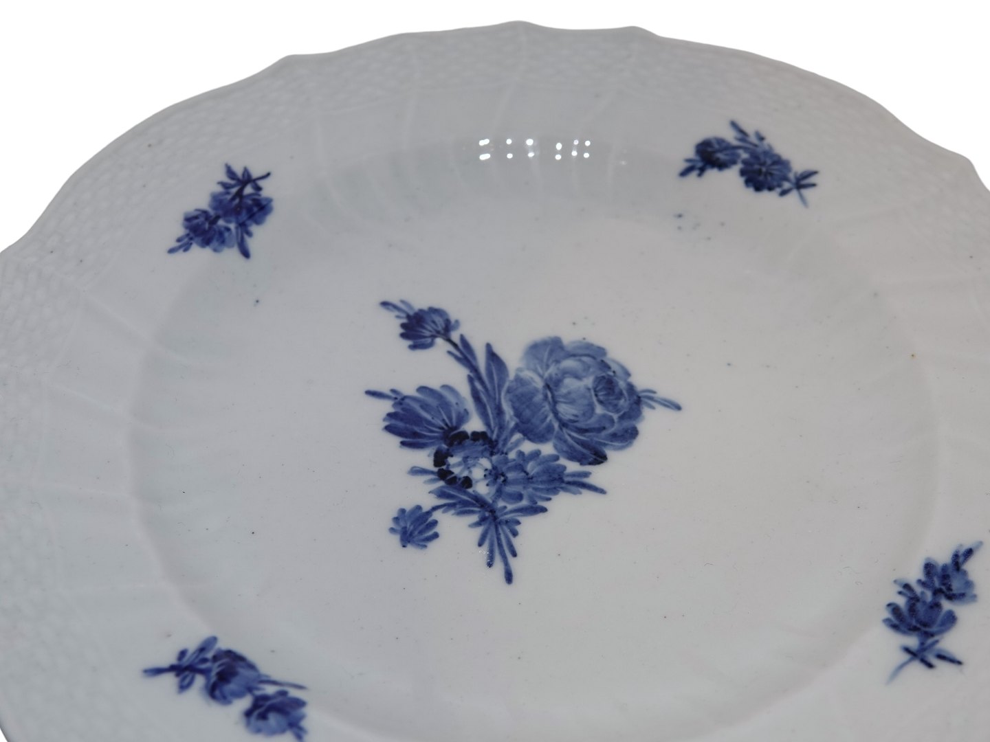 Royal Copenhagen Blå Blomst Svejfet, tidlig middagstallerken i svagt gråligt porcelæn.