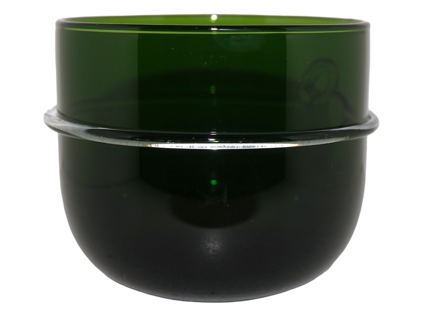 Small Holmegaard dark green glass flower pot. Designed by artist Michael Bang. Signed "HG5 MB". Diameter 9.2 cm., height 7.8 cm. Perfect condition.