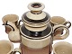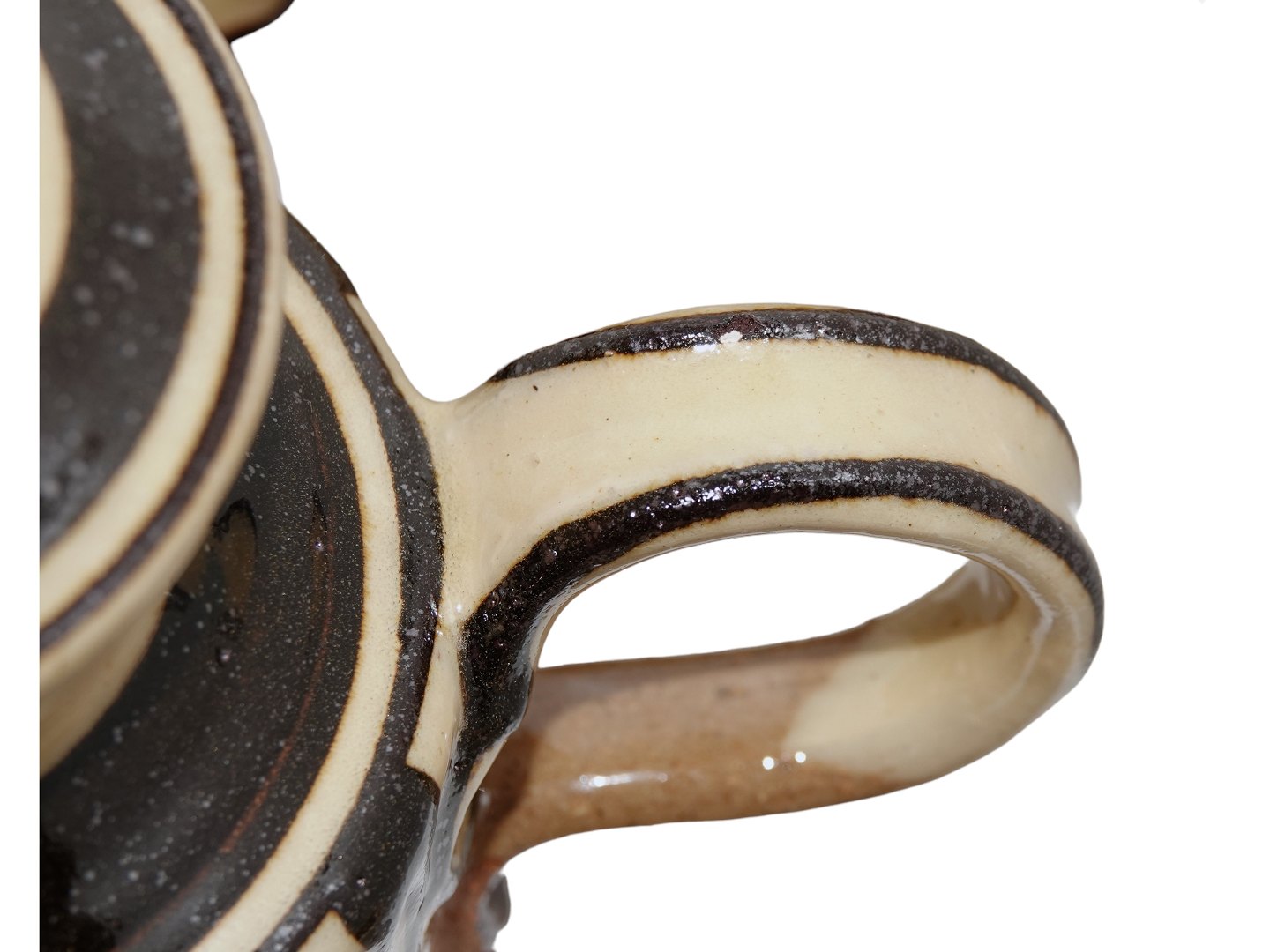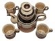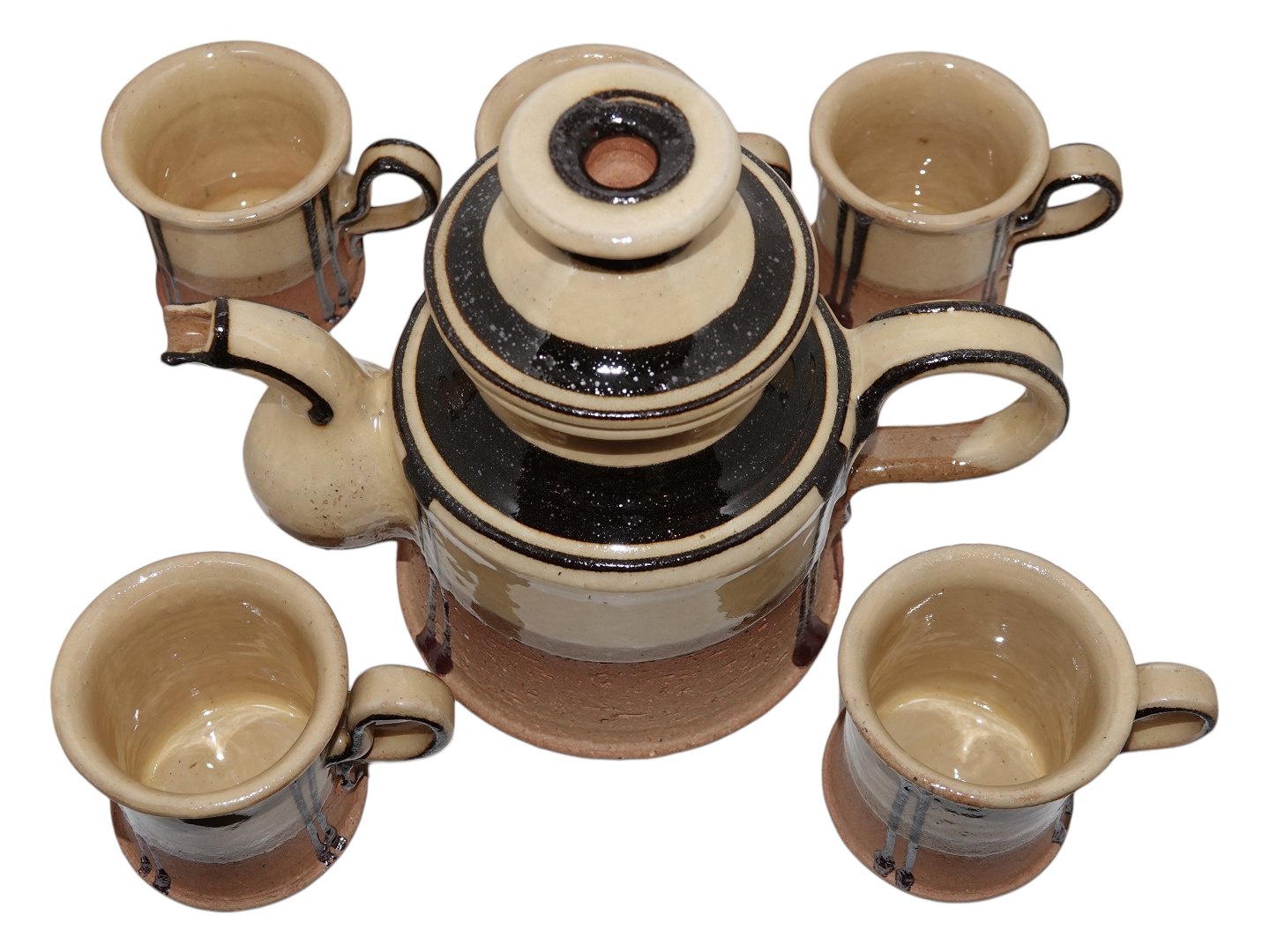 The teapot measures 19.5 cm. in height and 24.5 cm. in length. The tea mugs measure 7.3 cm. in height and 7.8 cm. in diameter.