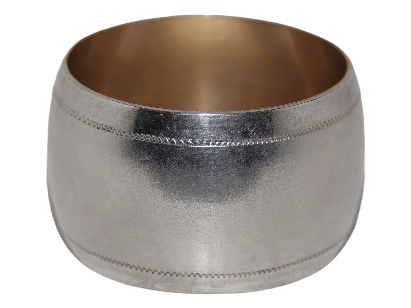 Servietring med forgyldt inderside. Der er to utydelige stempler, så den sælges som sølvplet. Bredde 2,7 cm. Flot og velholdt stand.