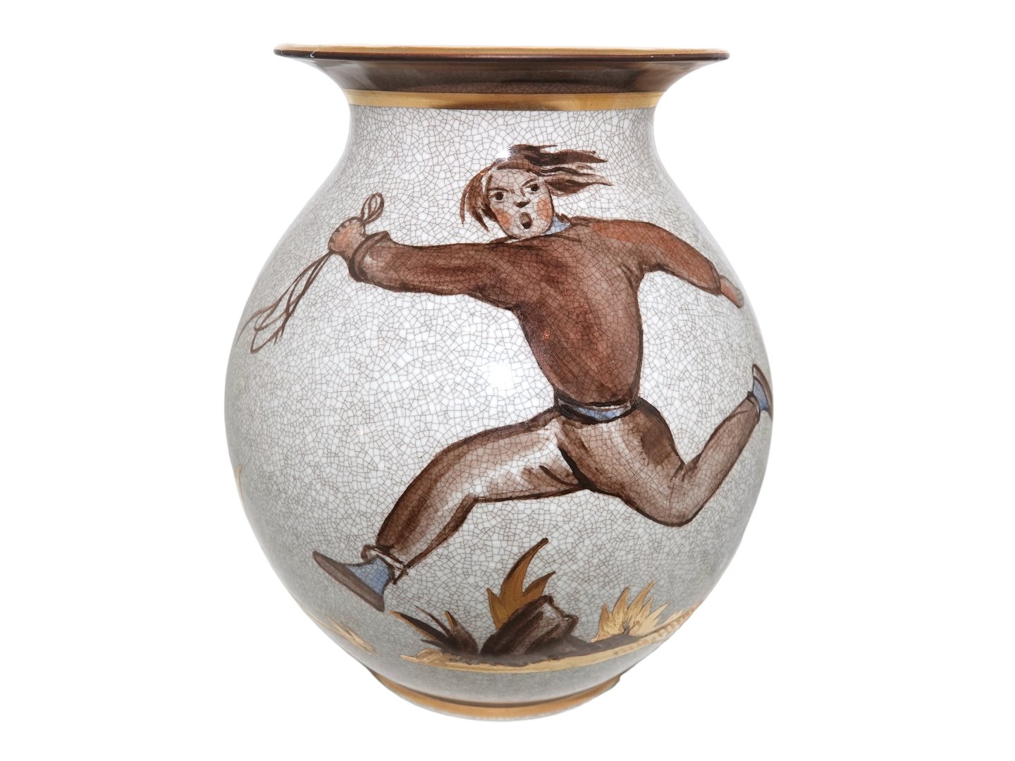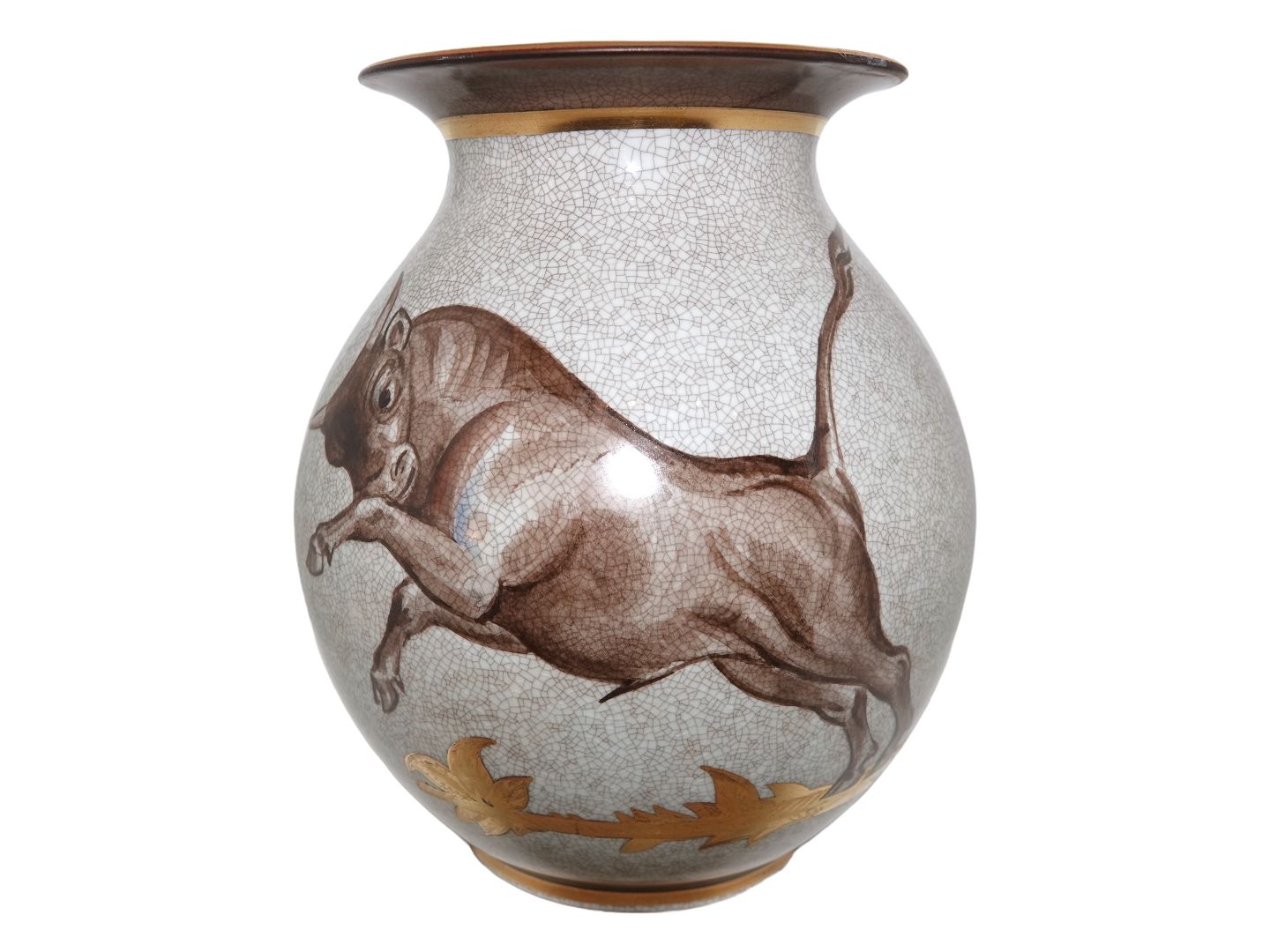 Royal Copenhagen unika Craquele (Krakele) vase dekoreret med en tyr og mand.