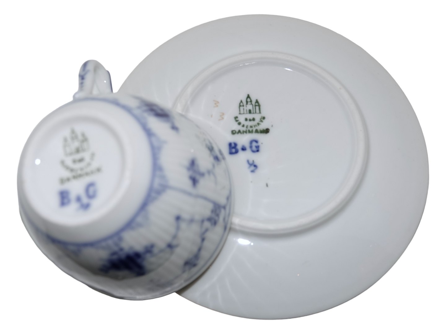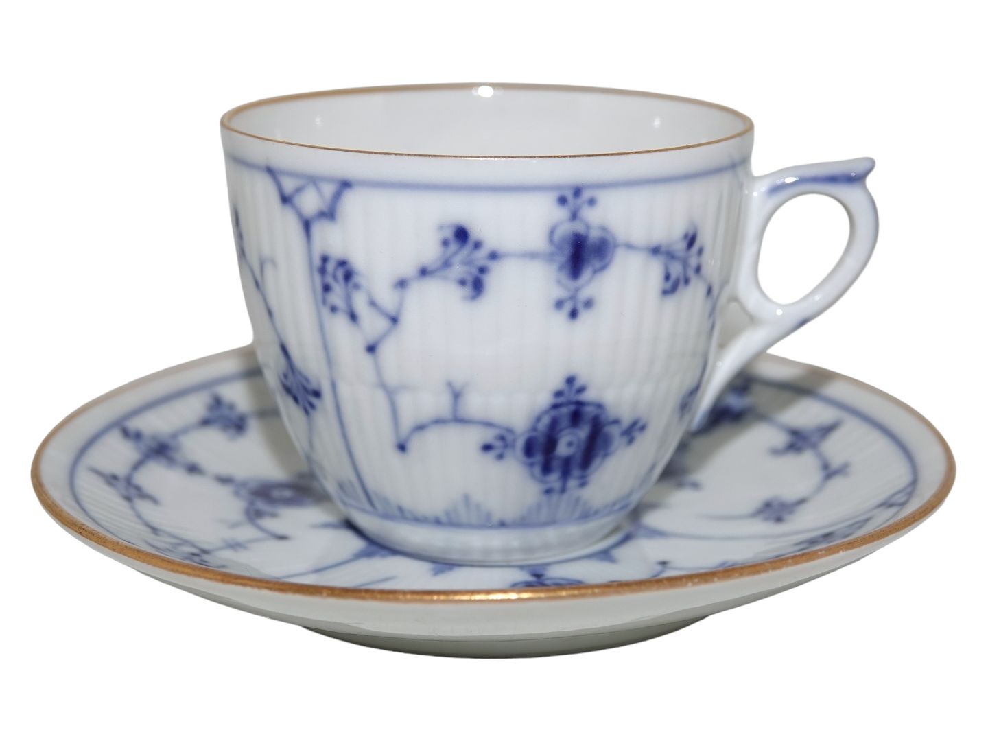 Bing & Grøndahl Musselmalet / Blåmalet Riflet med guldkant, kaffekop med underkop. Fabriksmærket viser, at denne er produceret mellem 1915 og 1948. 1. sortering. Koppen måler 7,1 cm. i diameter. Velholdt stand uden fejl.