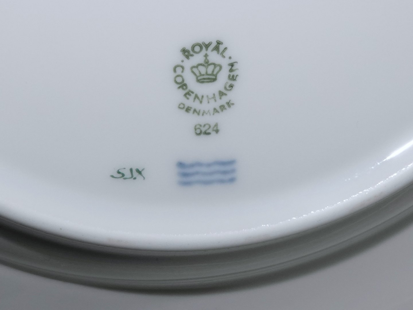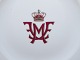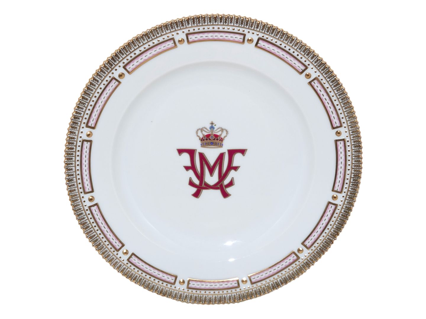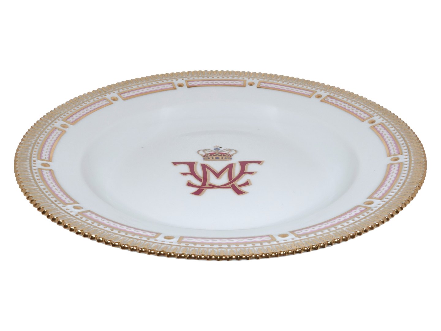 Royal Copenhagen Flora Danica, middagstallerken dekoreret med Kronprins Frederiks og Kronprinsesse Marys kronede monogram. Kronprinsparret fik et Flora Danica stel i Folkegave ved deres bryllup den 14. maj 2004.