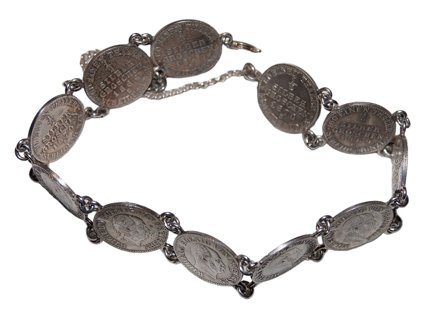 The bracelet is shaped of eight German silver coins 1/2 silber groschen from 1867 to 1870. Length 18.5 cm., width 1.5 cm. Excellent condition.