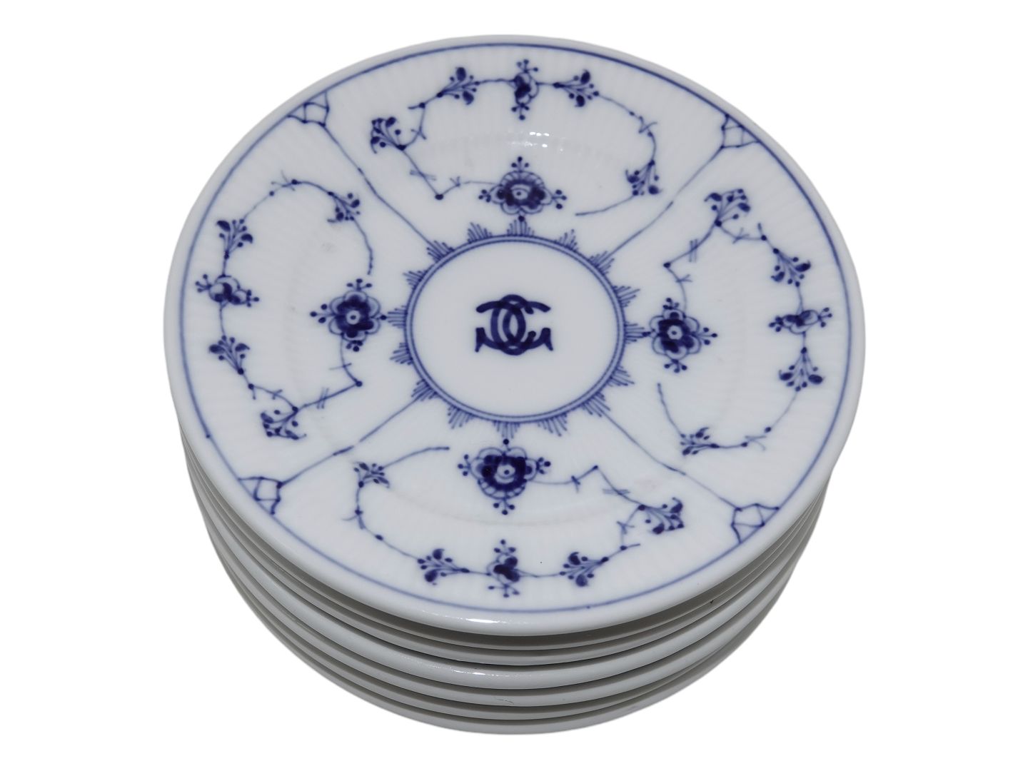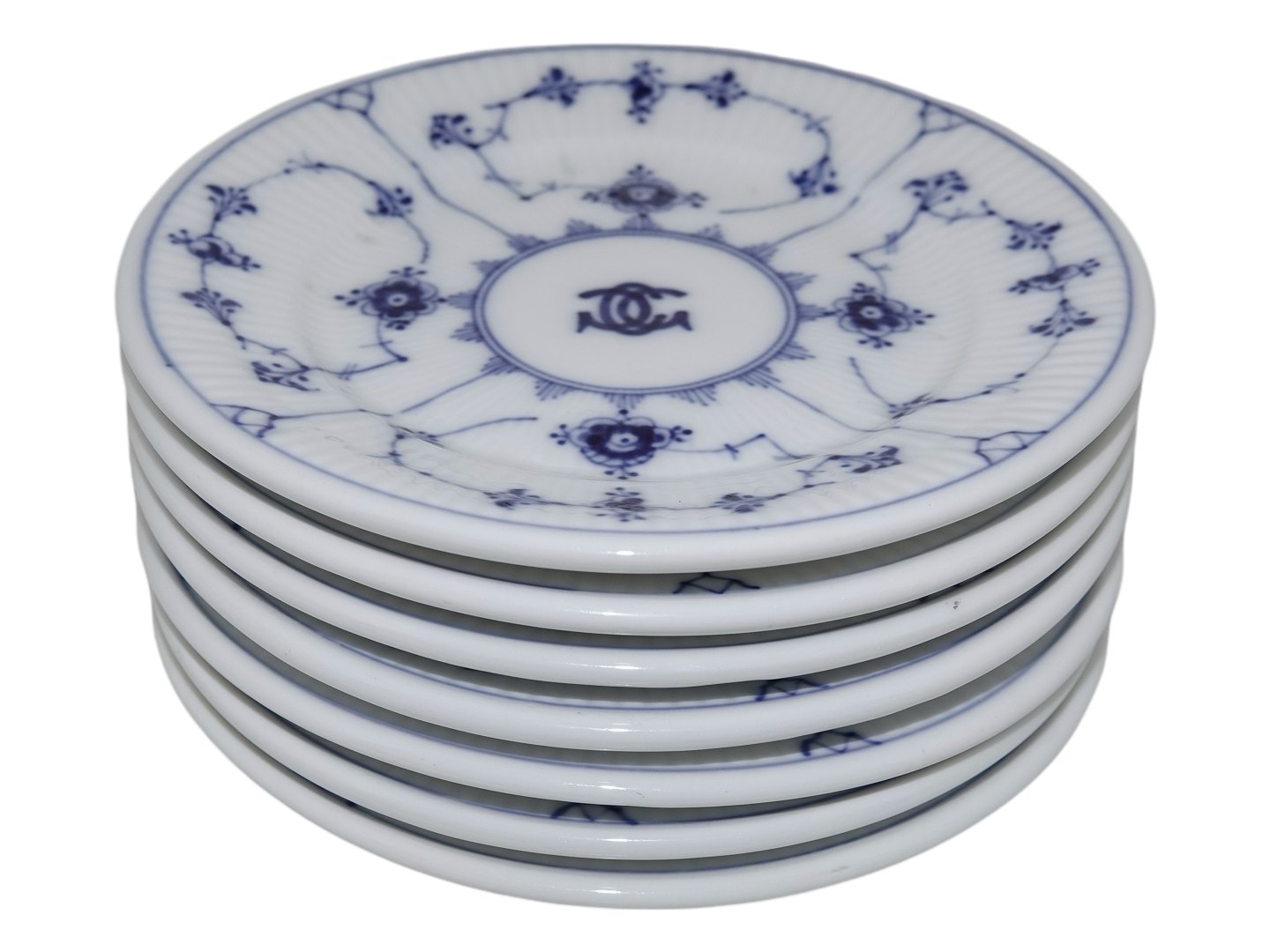 Royal Copenhagen Musselmalet Riflet Hotelporcelæn / jernporcelæn, lille brødtallerken med logo.