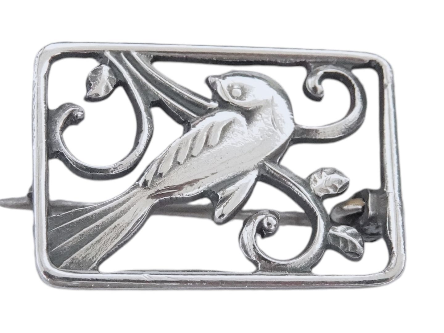Lille firkantet broche med fugl fra ca. 1940 til 1960.