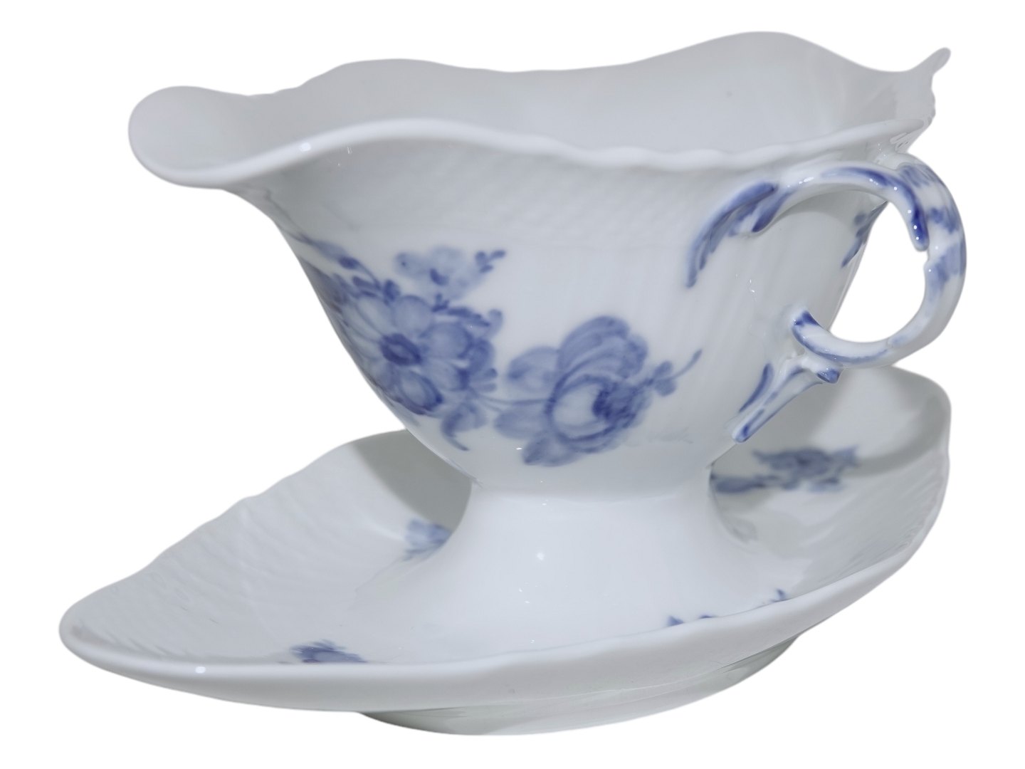 Royal Copenhagen Blå Blomst Svejfet, sjælden set sovseskål med to hanke.