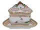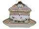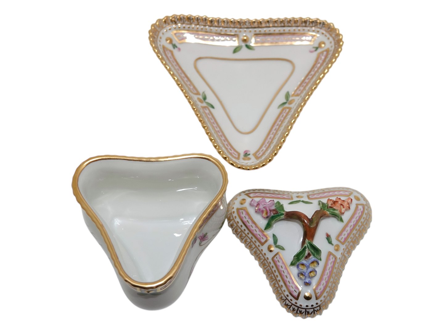 Royal Copenhagen Flora Danica, triangular lidded custard cup with matching triangular saucer. Custard cups are used for desserts.
