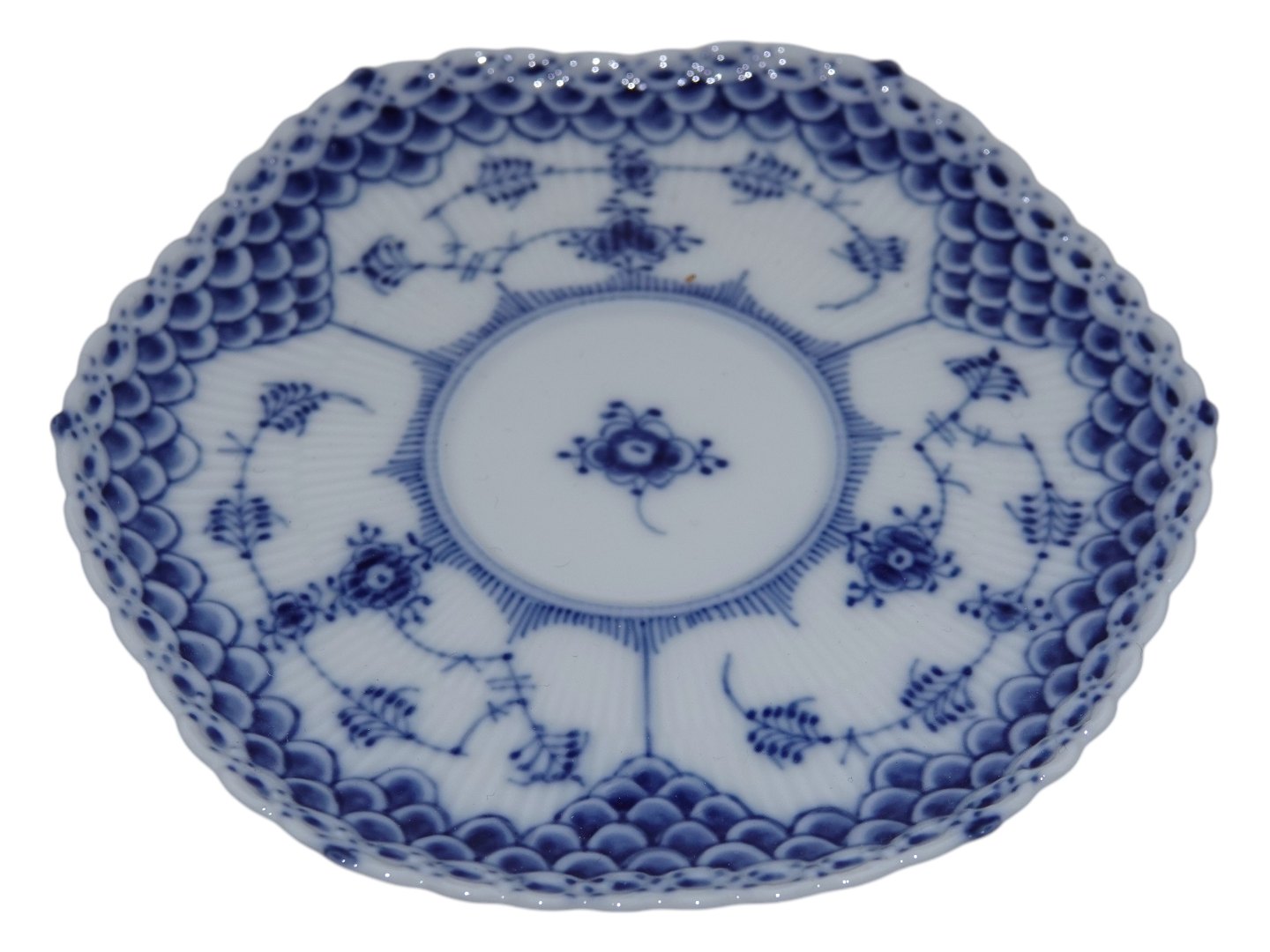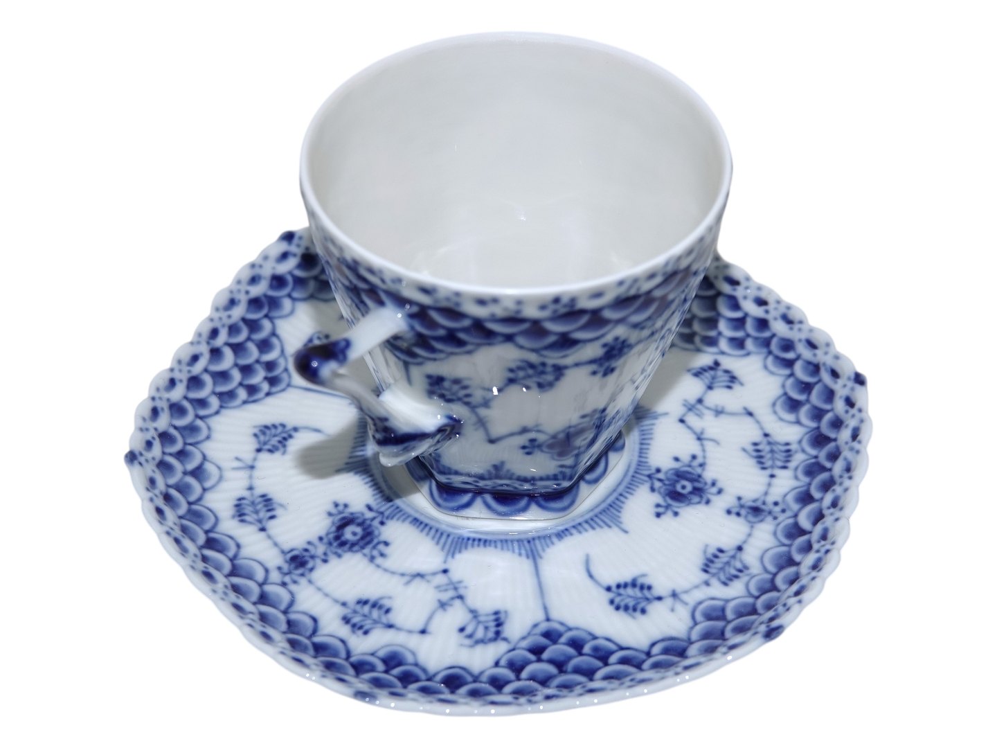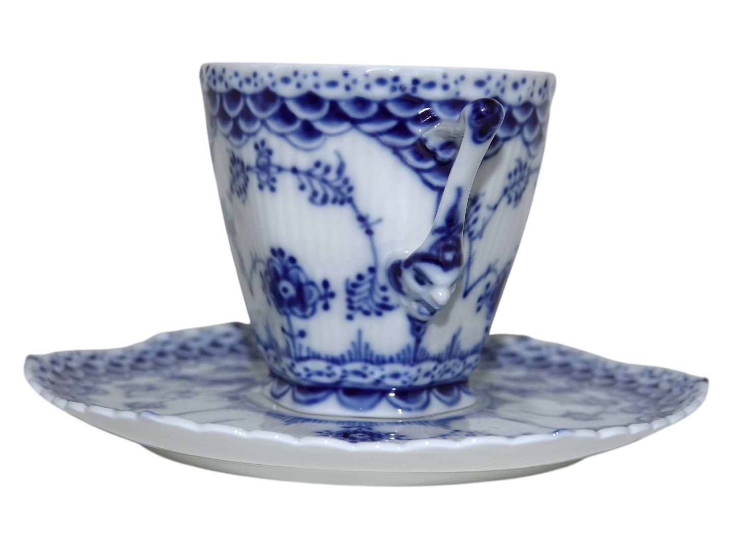 Royal Copenhagen Blue Fluted Full Lace, coffee cup with devil's head on the side and a matching saucer.