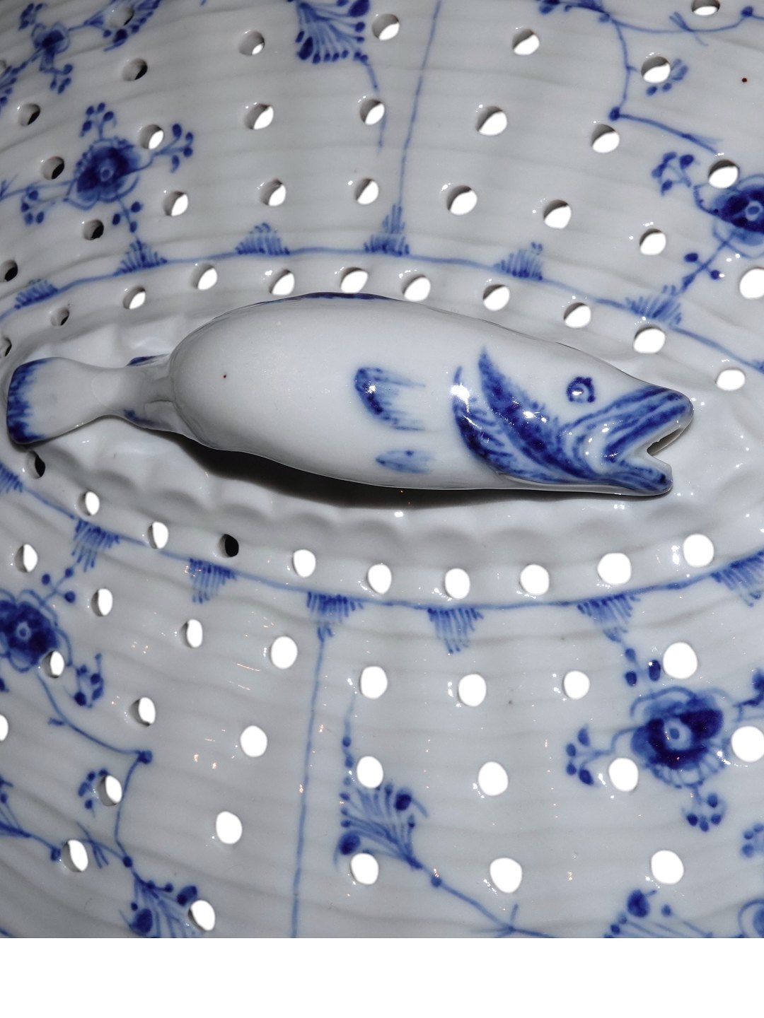Royal Copenhagen Musselmalet Riflet, sjælden fiskerist med figur af fisk.