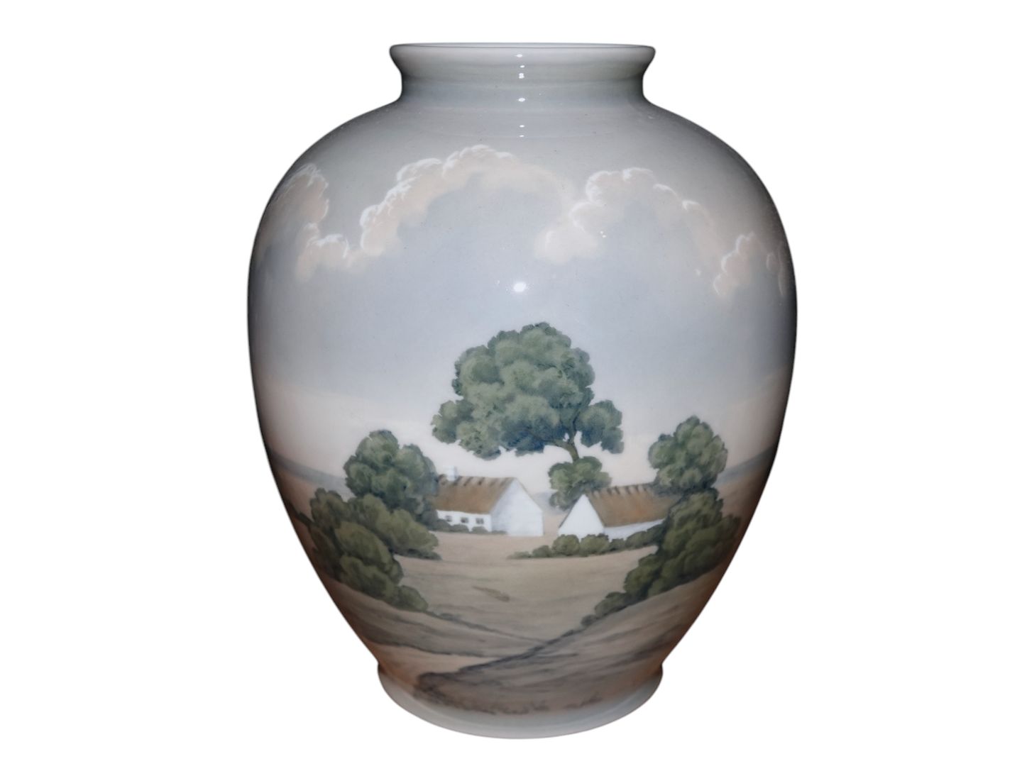 Bing & Grøndahl vase med dansk hvid bondegård. Vasen er dekoreret hele vejen rundt.