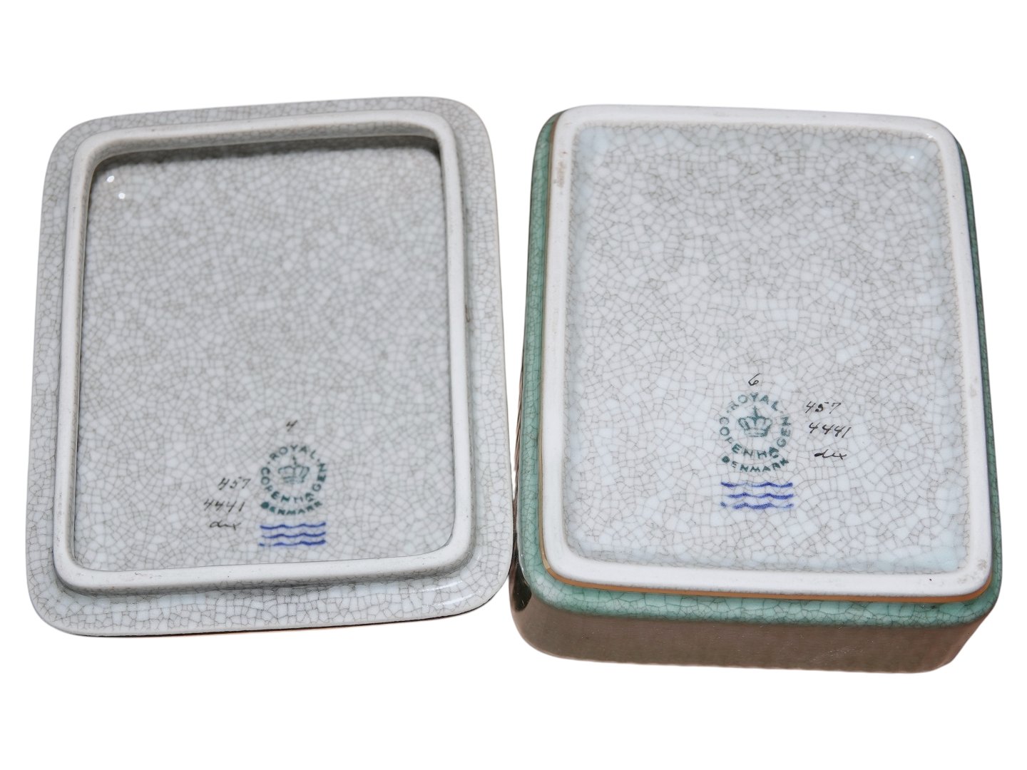 Royal Copenhagen green Craquele square lidded bowl.