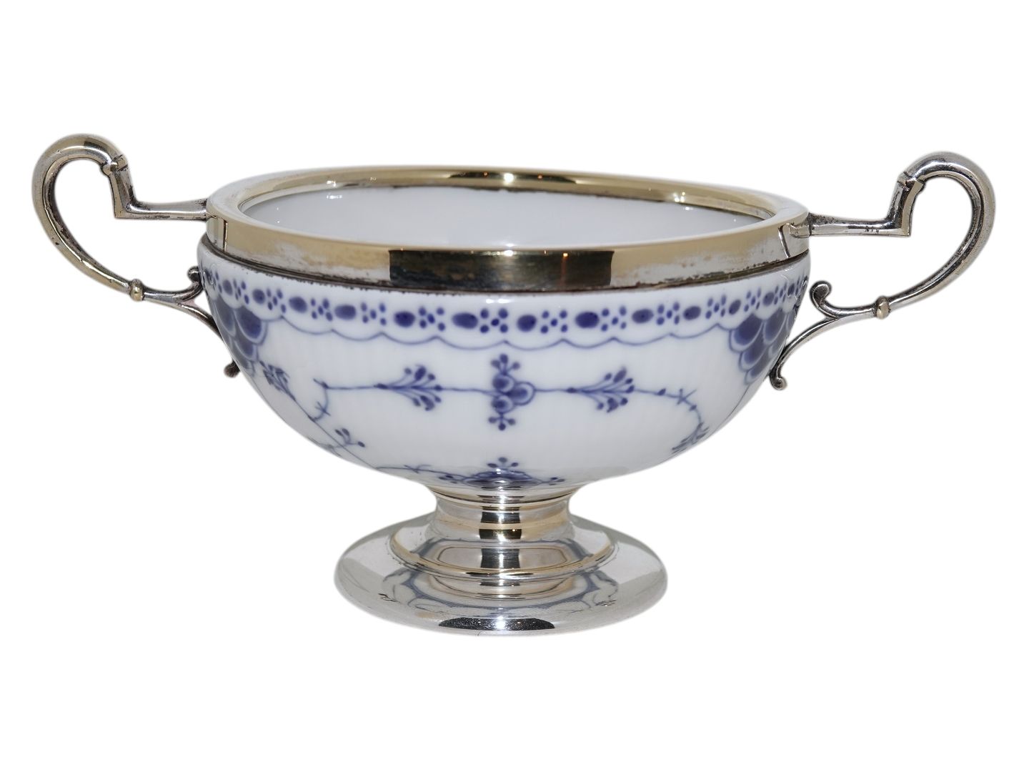 Royal Copenhagen Blue Fluted Half Lace, sugar bowl with silver plate stand and handles.