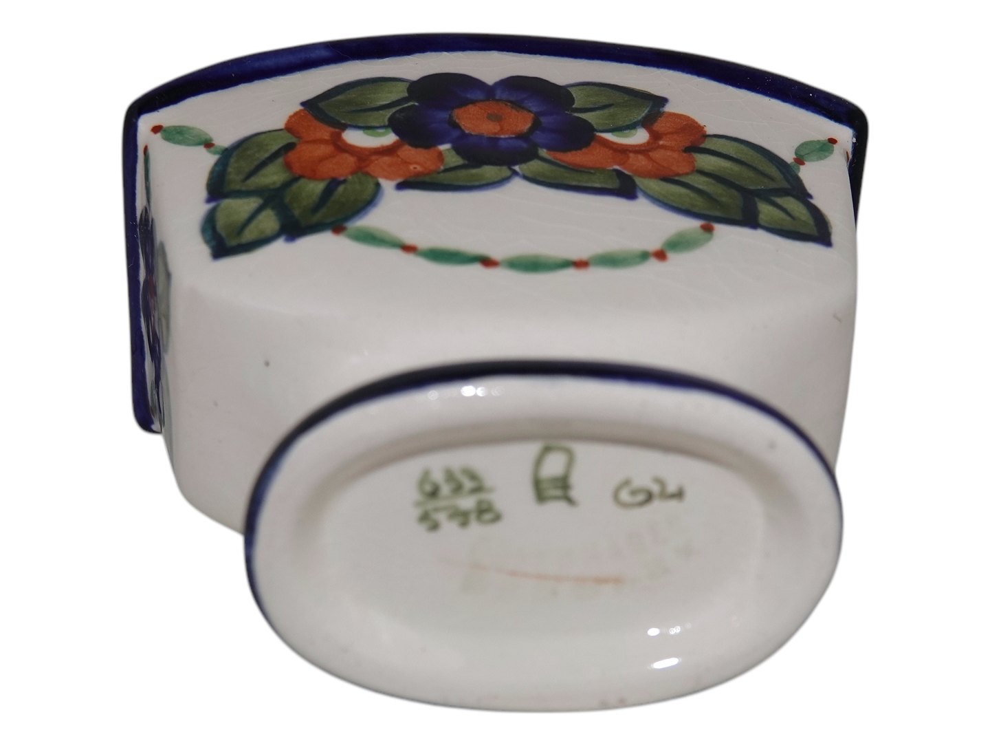 Aluminia lille vase med huller i toppen til blomsterstilke. Dekorationsnummer 633/558. Bredde 10,0 cm., højde 9,5 cm. Der er krakkeleringer i glasuren ellers perfekt stand.