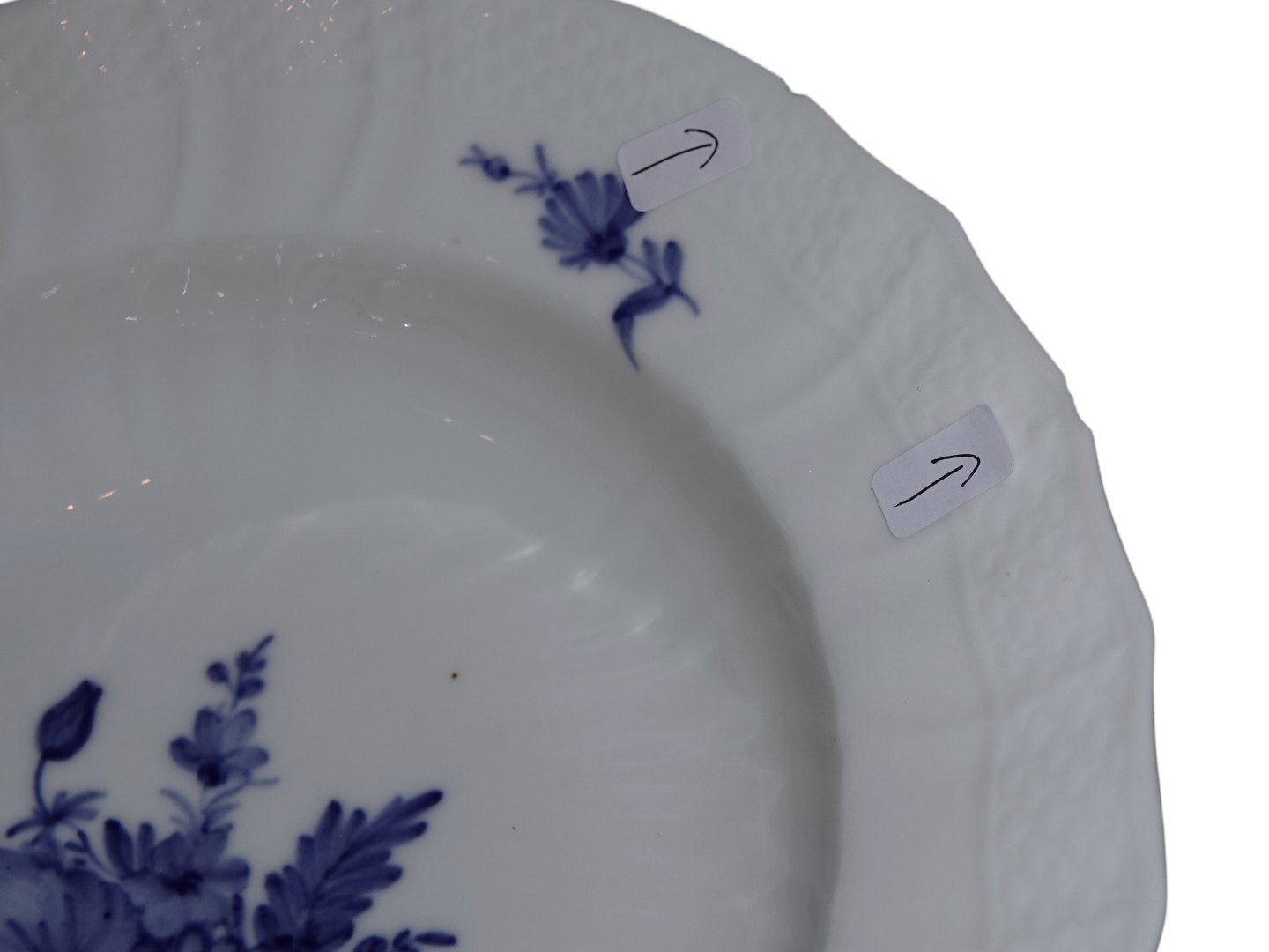 Royal Copenhagen Blå Blomst Svejfet, tidlig dyb suppetallerken. Denne er produceret omkring 1840 til 1860. Diameter 24,0 cm. 1. sortering. Der fire skår på kanten, se fotos. Internt varenummer: BLÅBLOMST7.