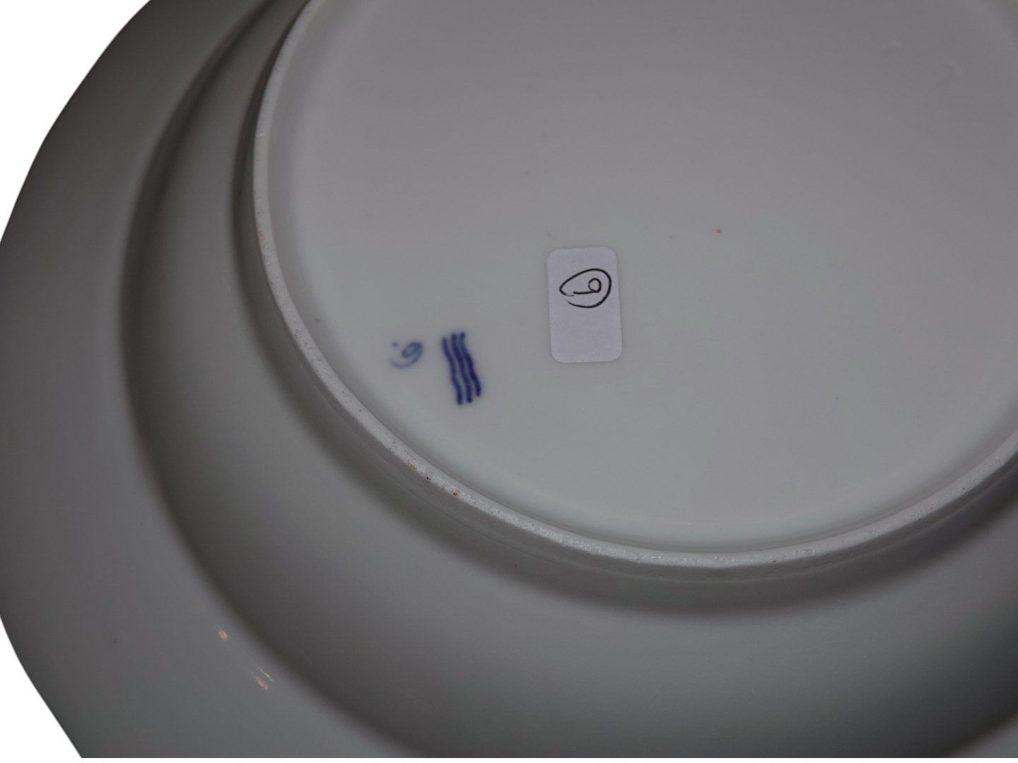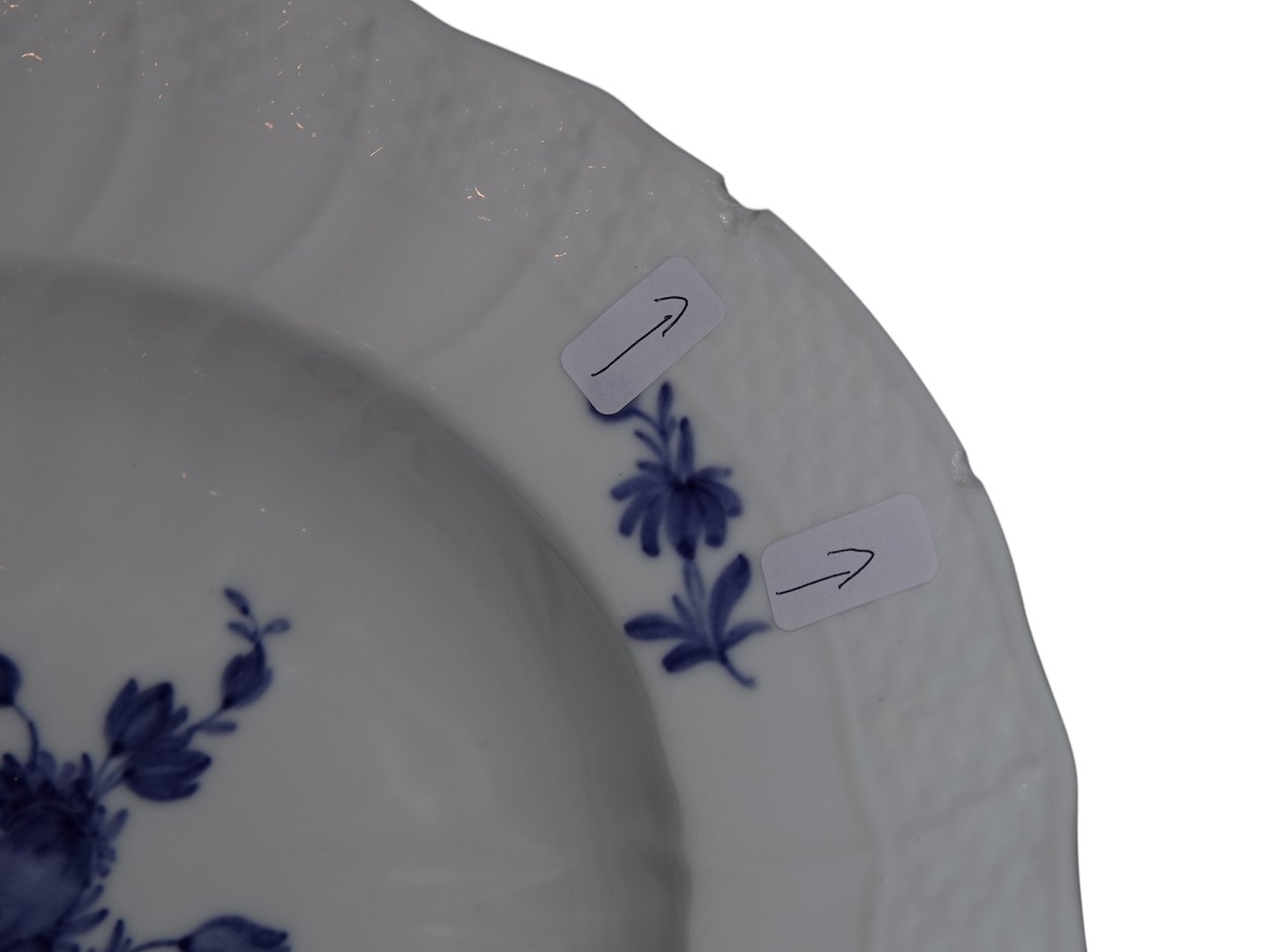 Royal Copenhagen Blå Blomst Svejfet, tidlig dyb suppetallerken. Denne er produceret omkring 1840 til 1860. Diameter 24,0 cm. 1. sortering. Der to skår på kanten, se fotos. Internt varenummer: BLÅBLOMST9.