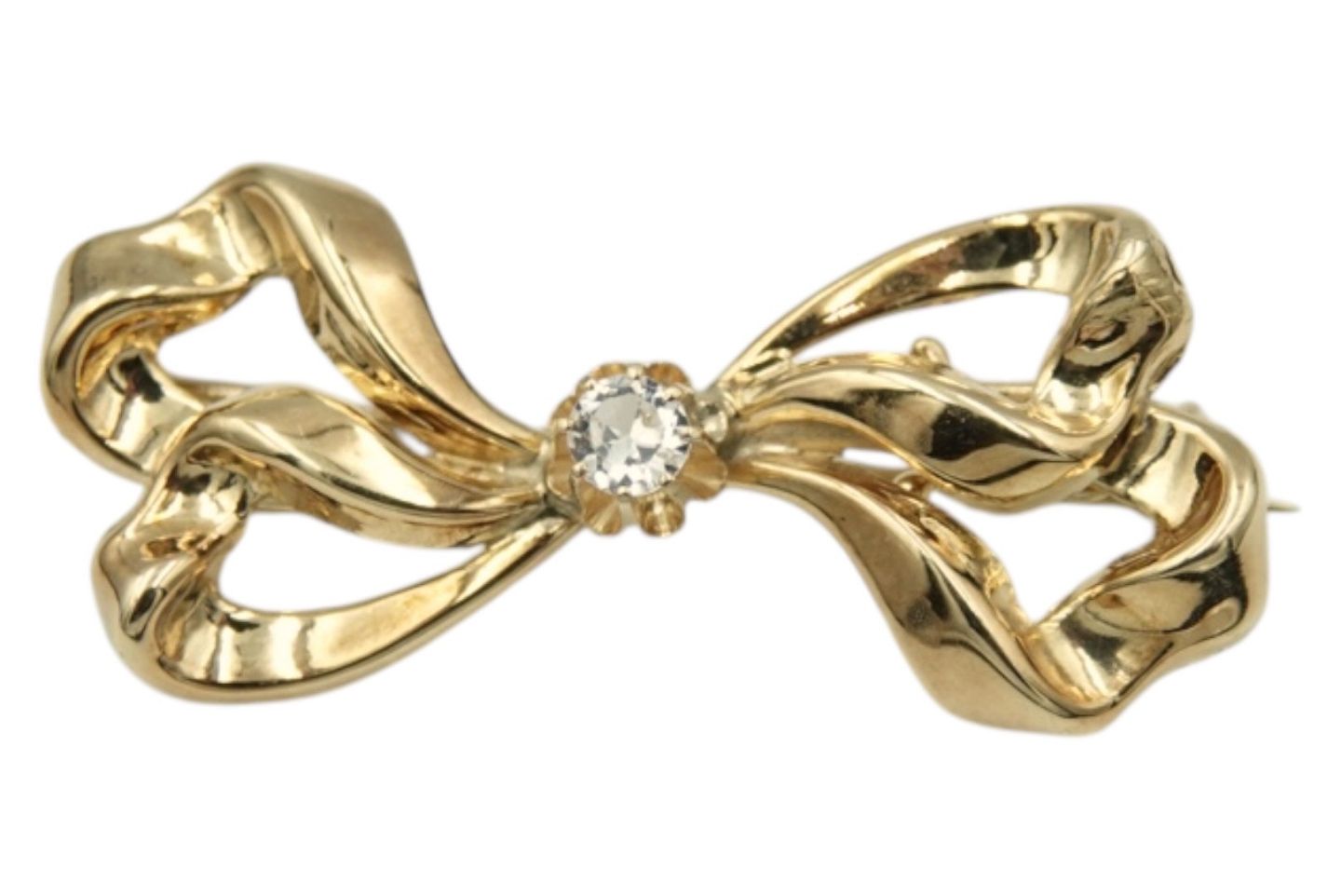 14 karat guld, lille sløjfe broche med klar sten. Stemplet "585" samt utydeligt mesterstempel. Måler 3,5 x 1,5 cm. Fin og velholdt stand.