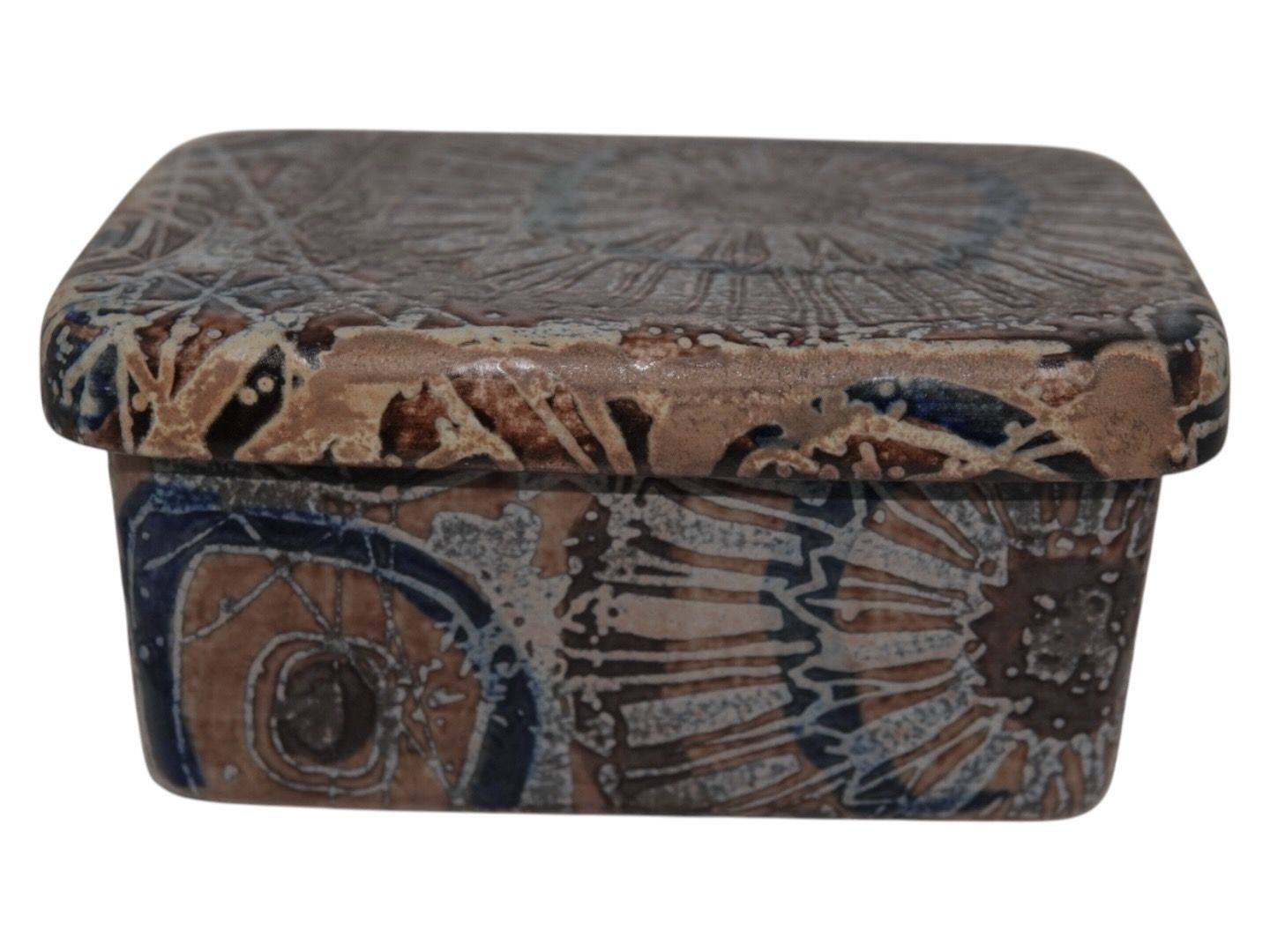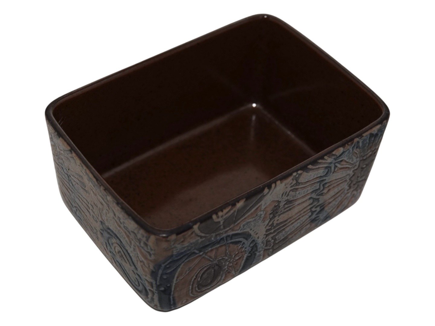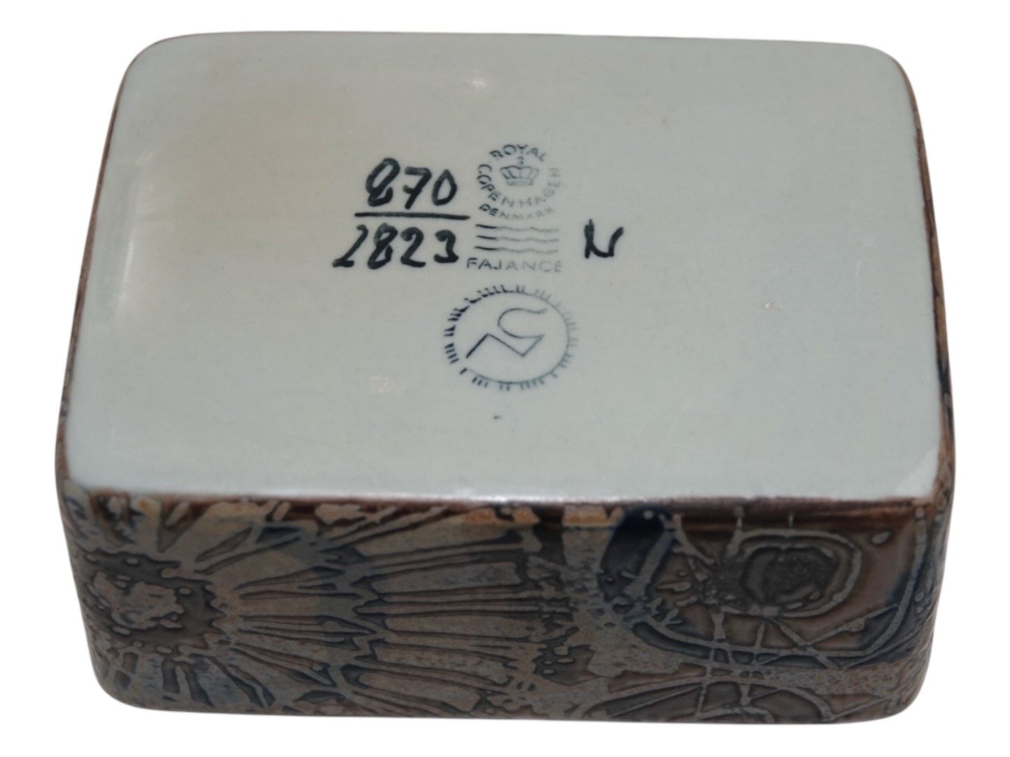 Royal Copenhagen Fajance Baca, brun smørskål. Dekorationsnummer 870/2823. Designet af Nils Thorsson. 1. sortering. Måler 11,5 x 8,5 cm. Perfekt stand uden fejl.