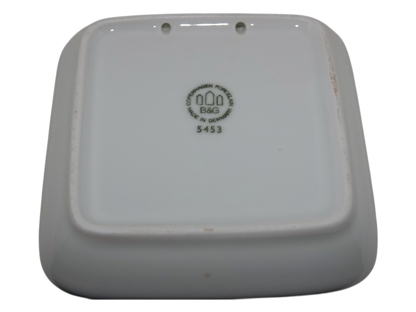 Hvid Bing & Grøndahl firkantet asiet. Af fabriksmærket ses det, at disse er produceret mellem 1970 og 1983. Dekorationsnummer 5453. 1. sortering. Måler 10,5 x 10,4 cm. Perfekt stand uden fejl.