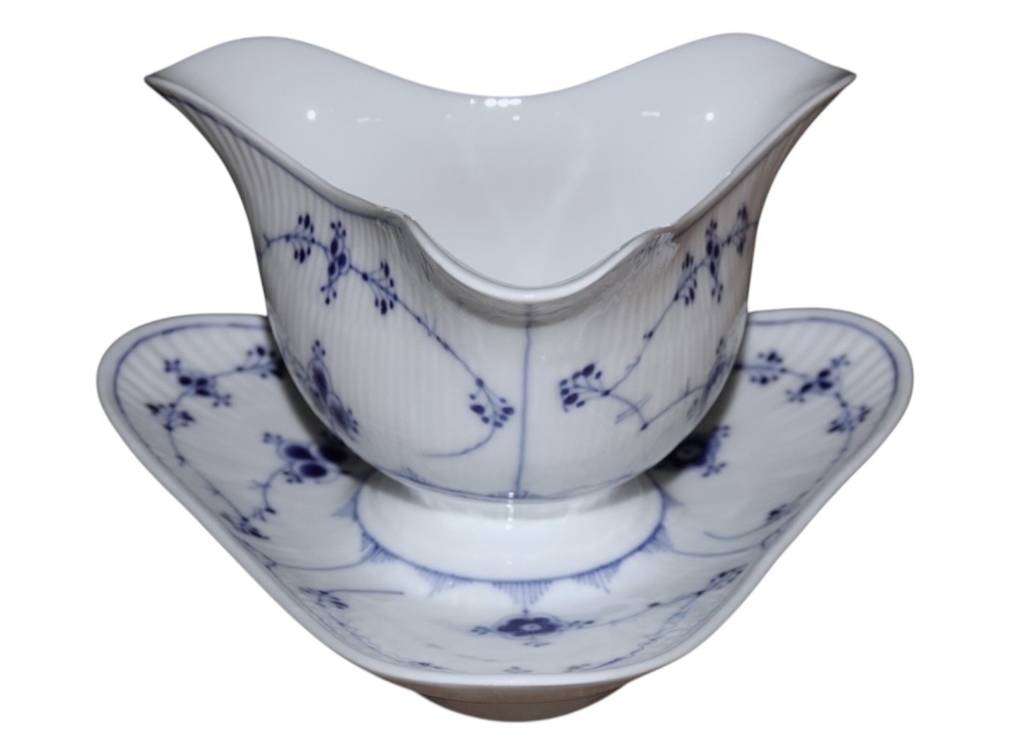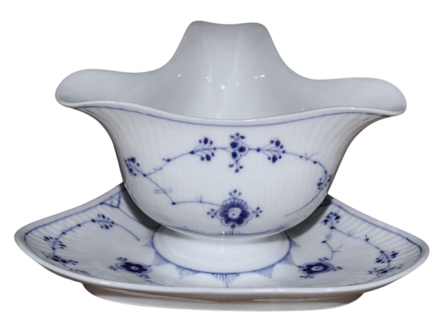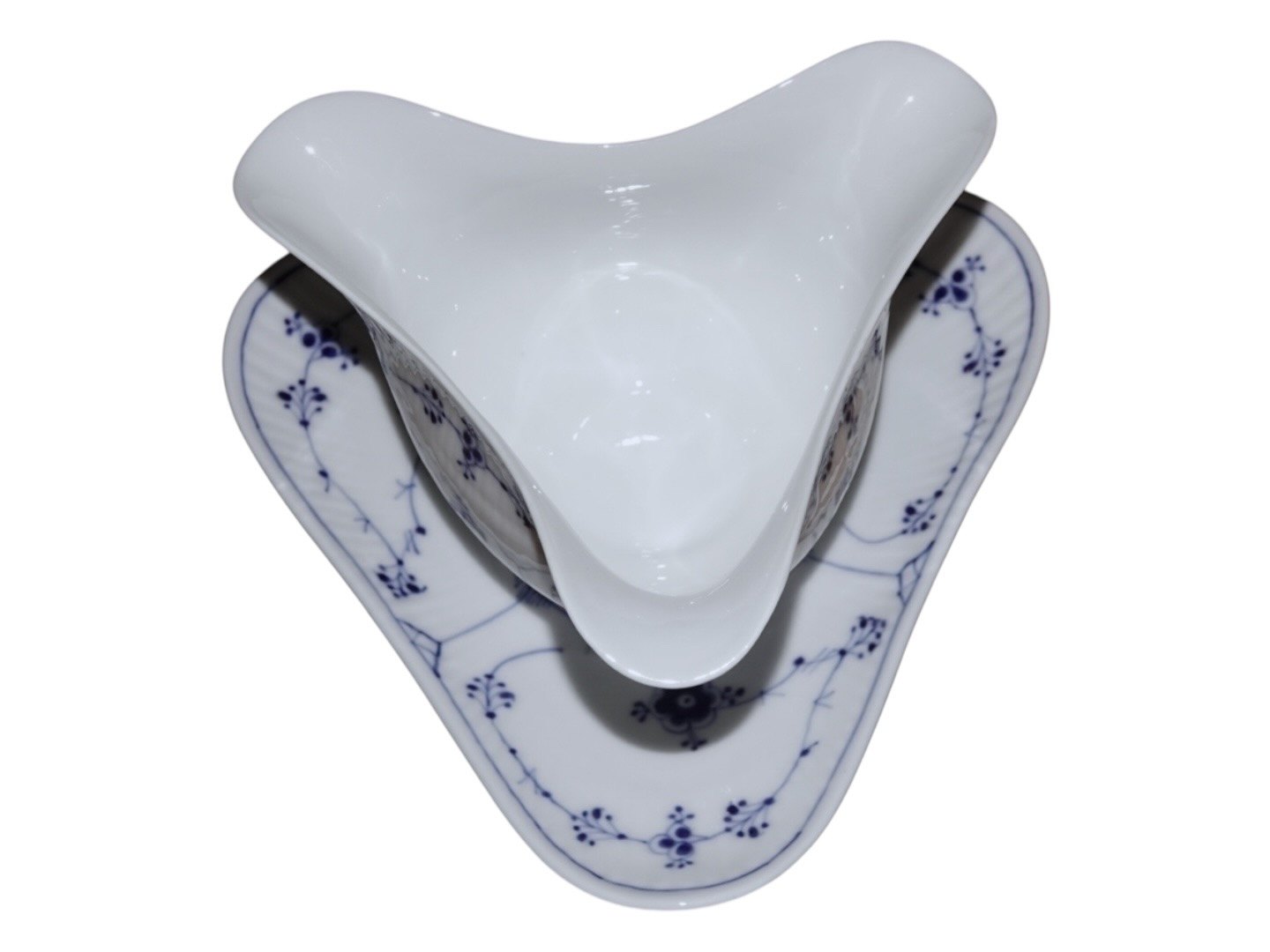 Royal Copenhagen Blue Fluted Plain, gravy boat on a triangular plate.