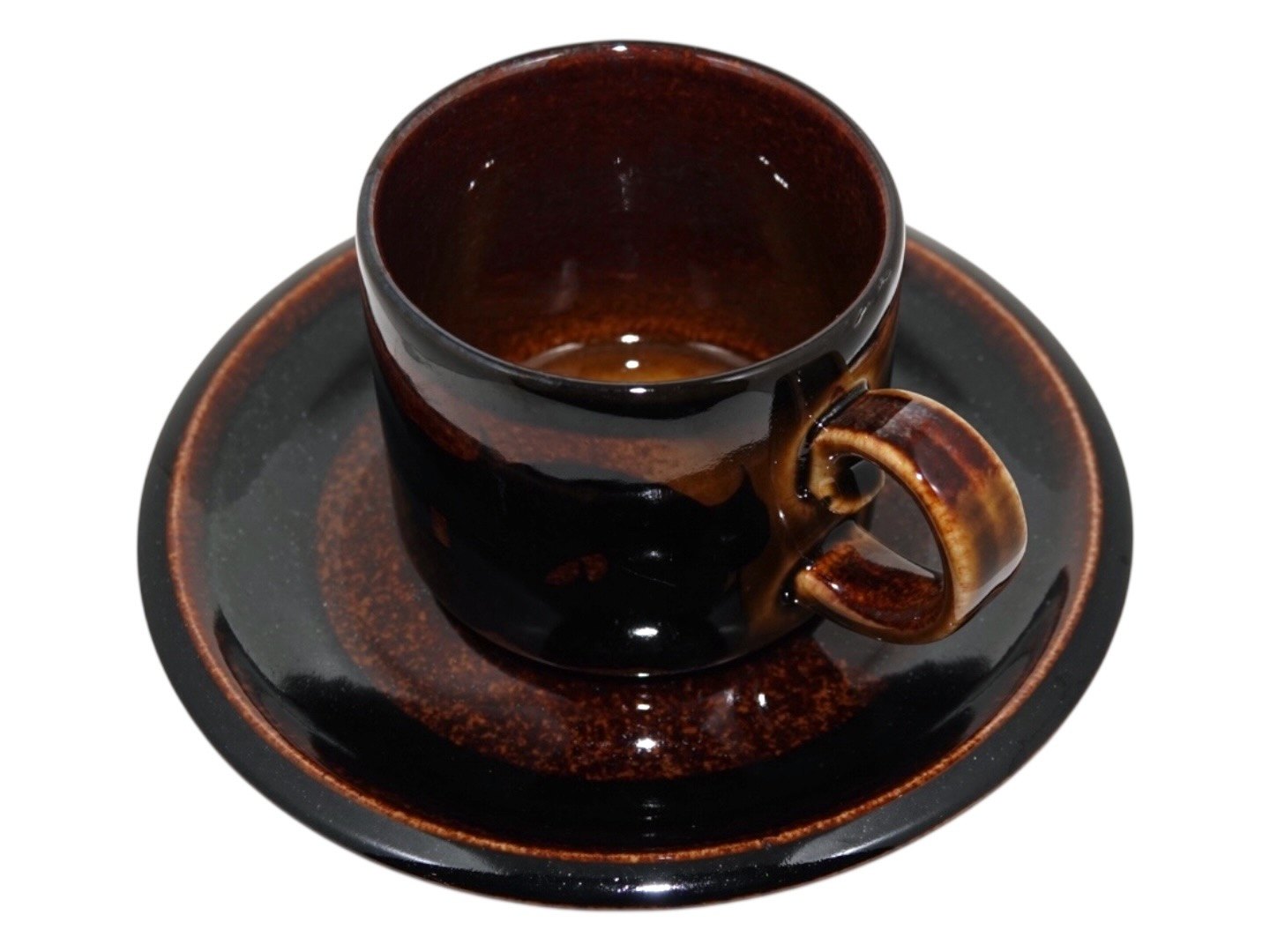 Arabia Finland Soraya, coffee cup with matching saucer. Designed by Gunvor Olin-Grønqvist and only produced between 1969 and 1972. The cup measures 7.5 cm. across and 6.6 cm. in height. Perfect condition.