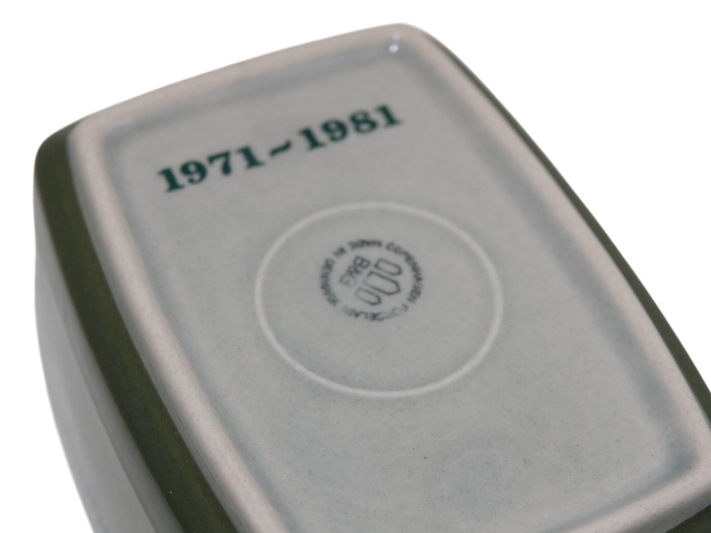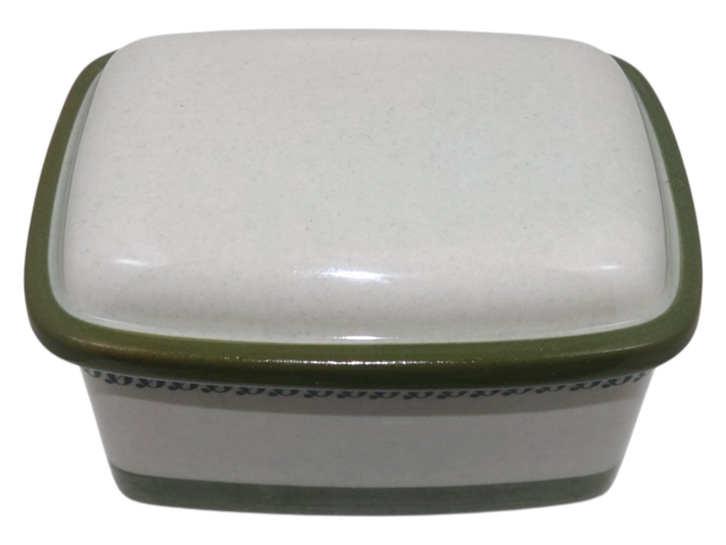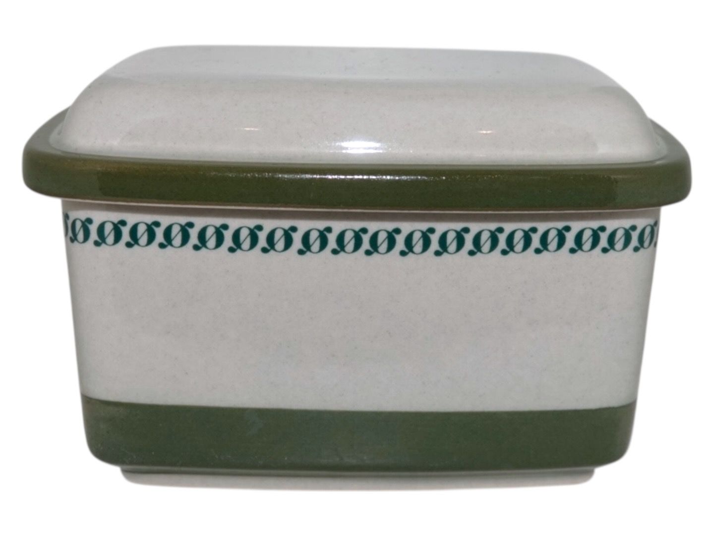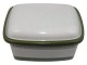 Bing & Grøndahl, firkantet smørskål med grøn stribe og en stribe "Ø". Med dato 1971-1981. 1. sortering. Indvendig mål 11,8 x 8,6 cm., højde 6,7 cm. Perfekt stand uden fejl.