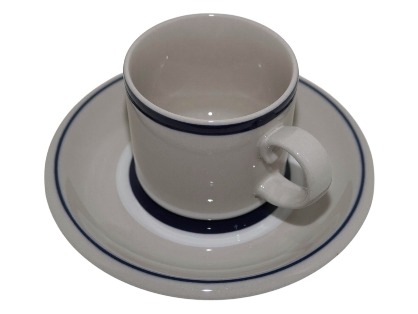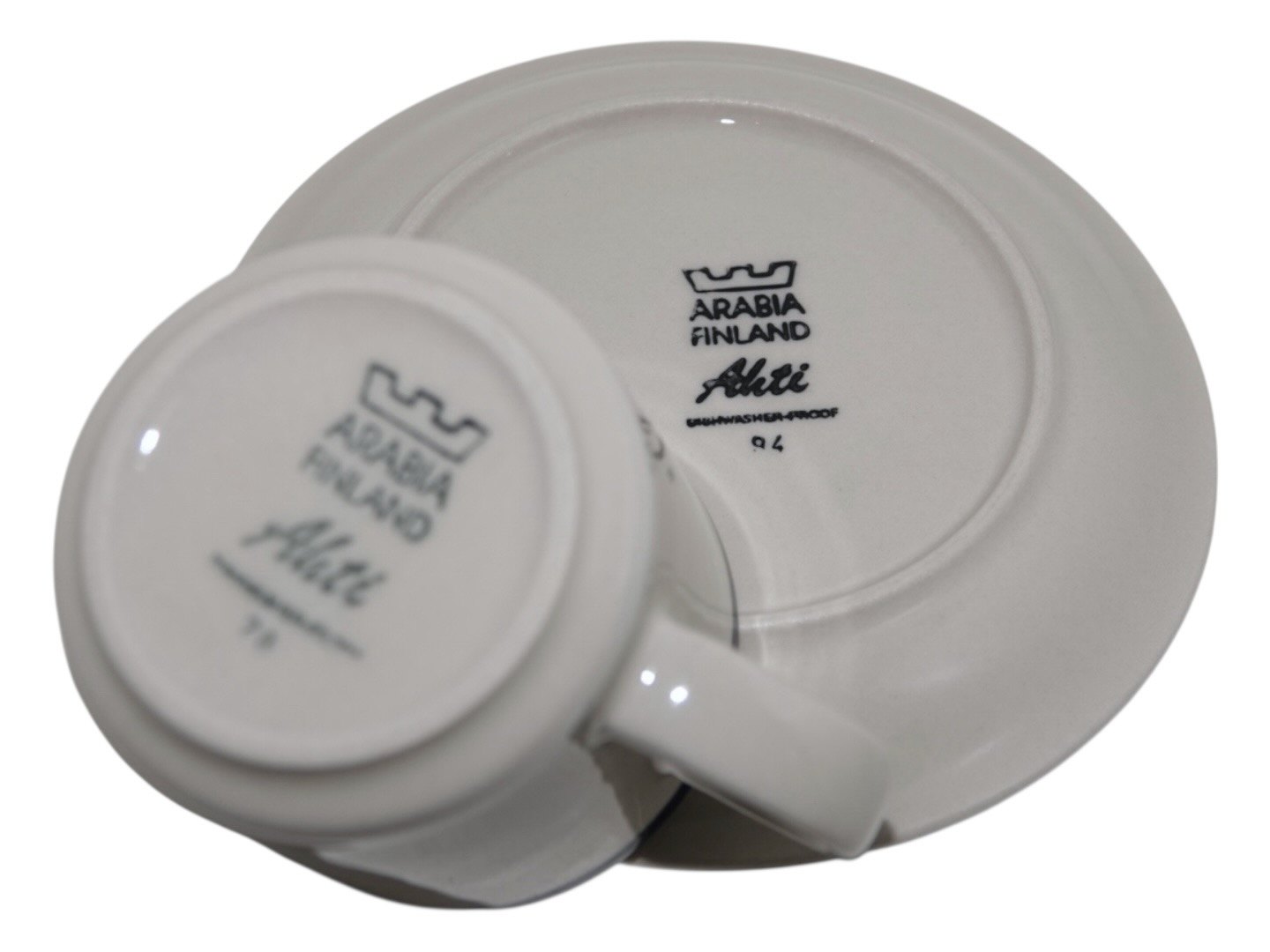 Arabia Finland Ahti, small coffee cup with matching saucer. Designed by Anja Jaatinen-Winquist in the 1980'es. The cup measures 6.5 cm. across and 6.0 cm. in height. Perfect condition.