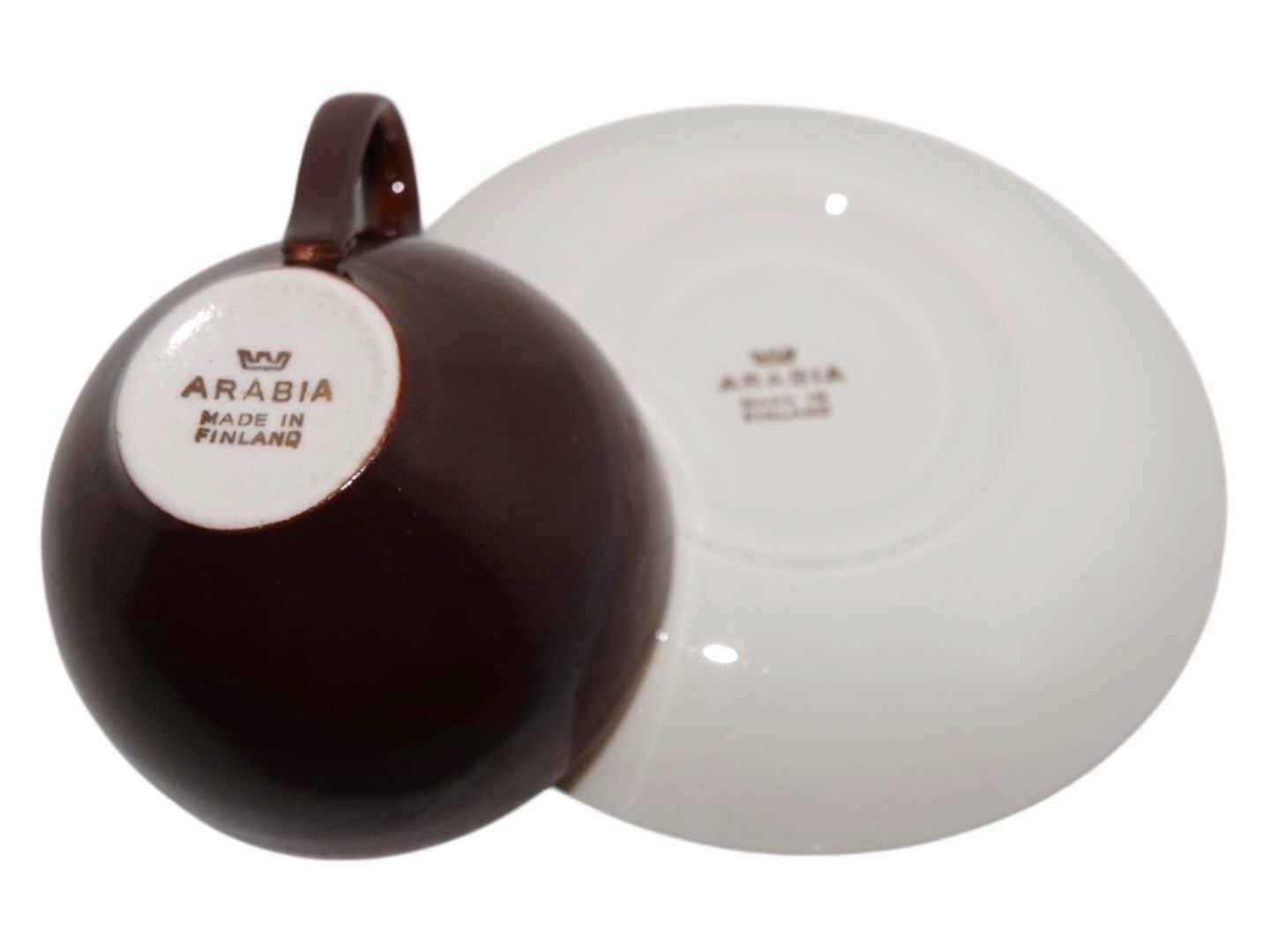 Arabia Finland, ekstra lille mørkebrun kop med tilhørende underkop. Diameter på koppen er 6,5 cm. og højden er 4,0 cm. Fin og velholdt stand.