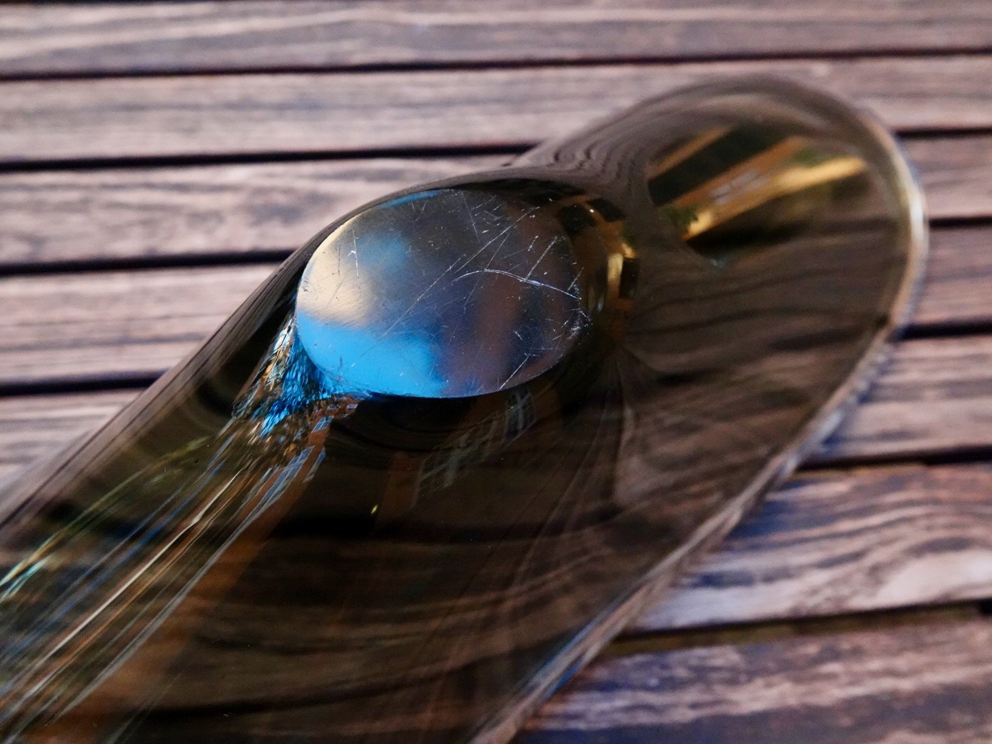 Formentlig Svensk glasværk men kunne også være Holmegaard, ekstra lang bordskål i røgfarvet glas.