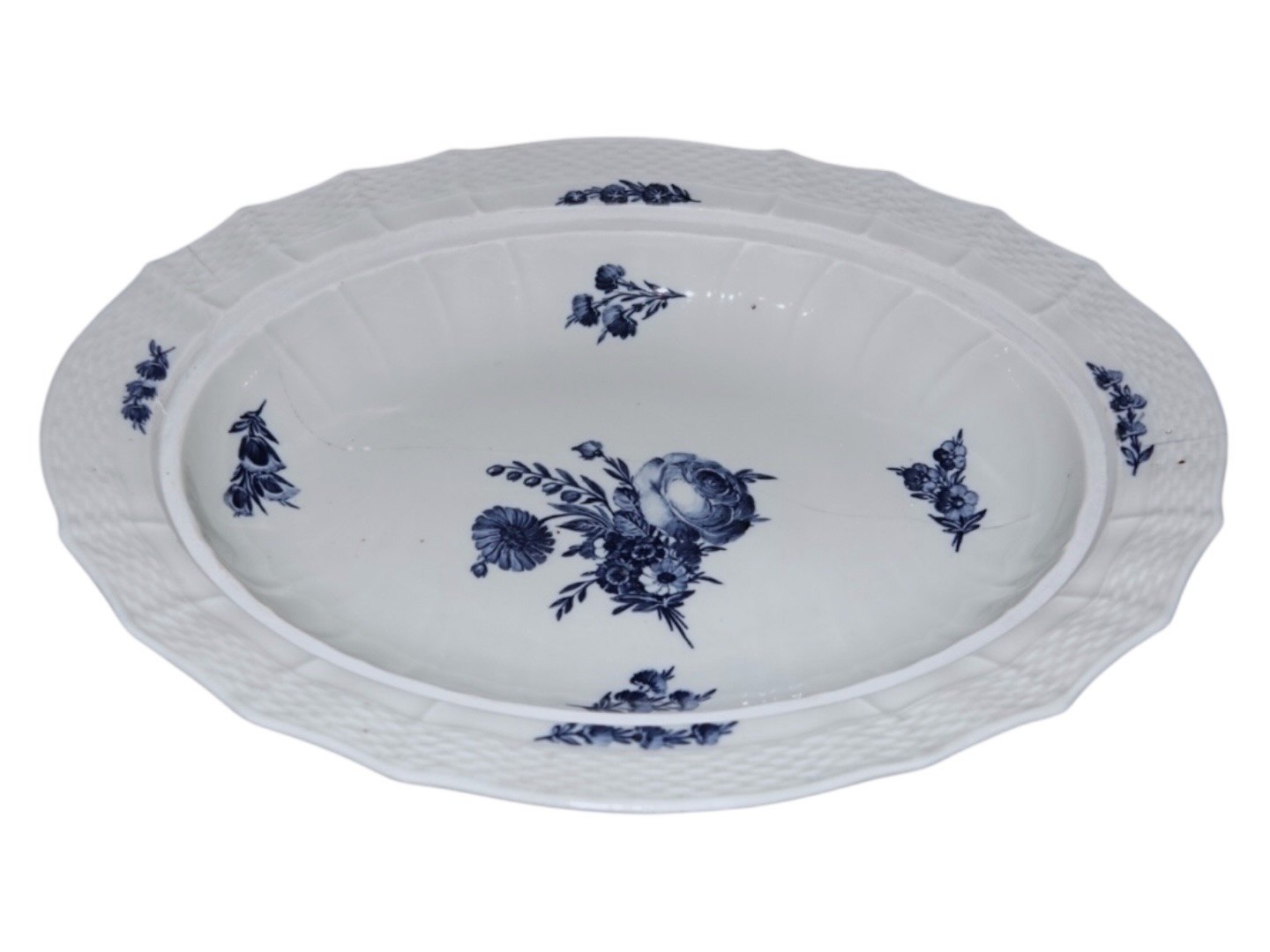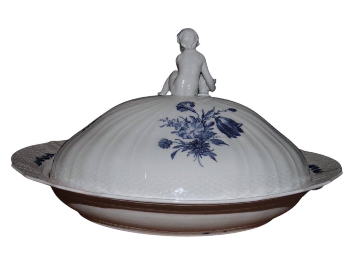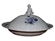 Royal Copenhagen Blå Blomst Svejfet, ekstra stor og sjælden skål med låg med figur af dreng (putto). Det er en tidlig udgave, hvor porcelænet er gråt fremfor hvidt.