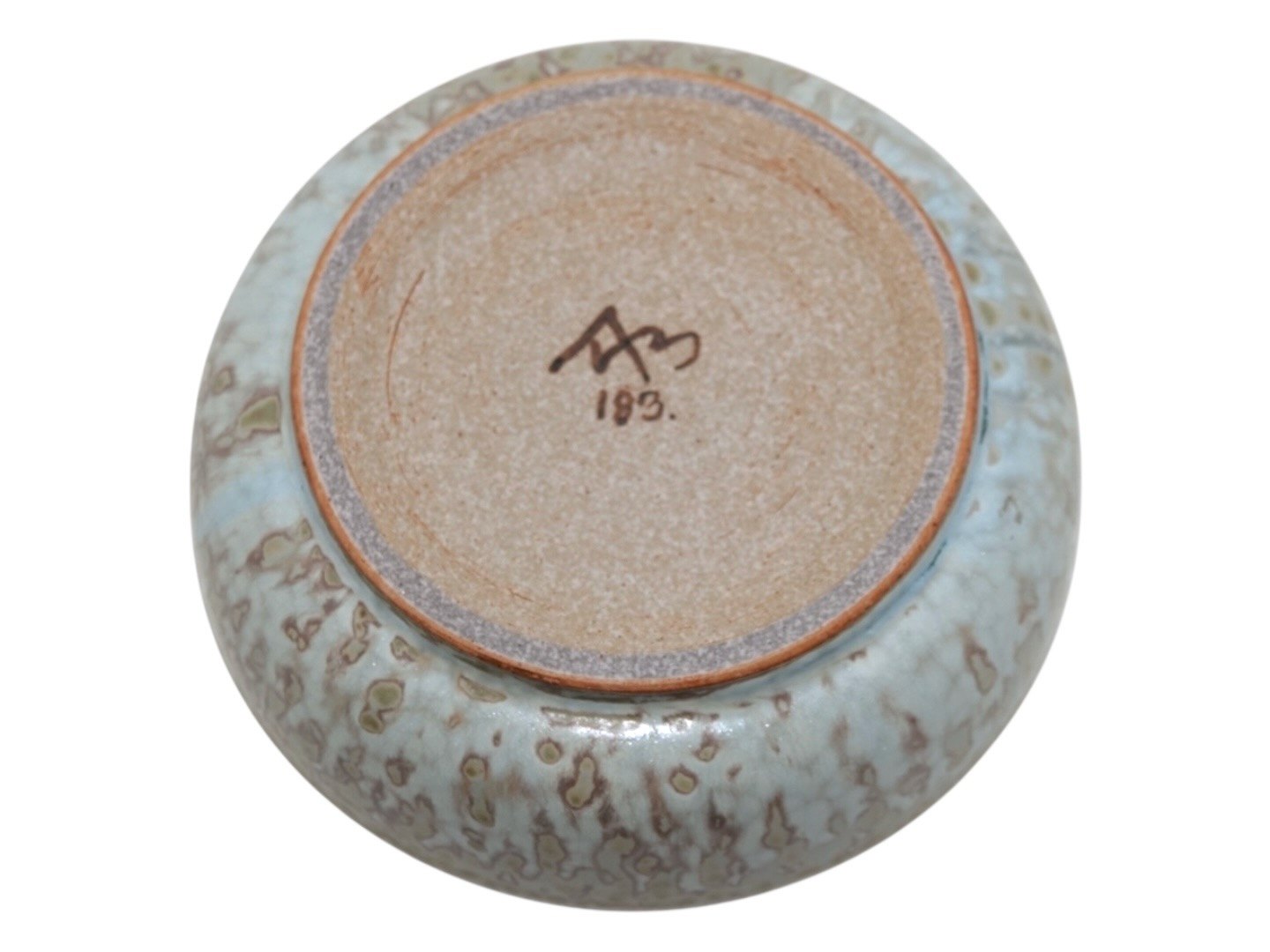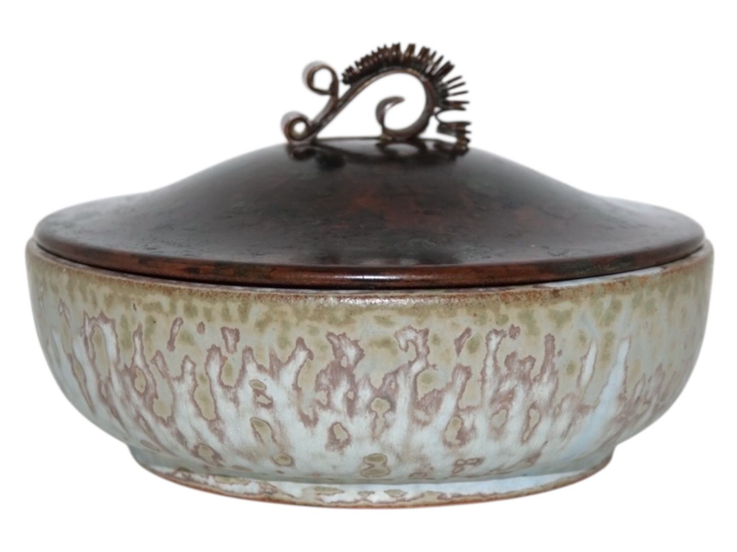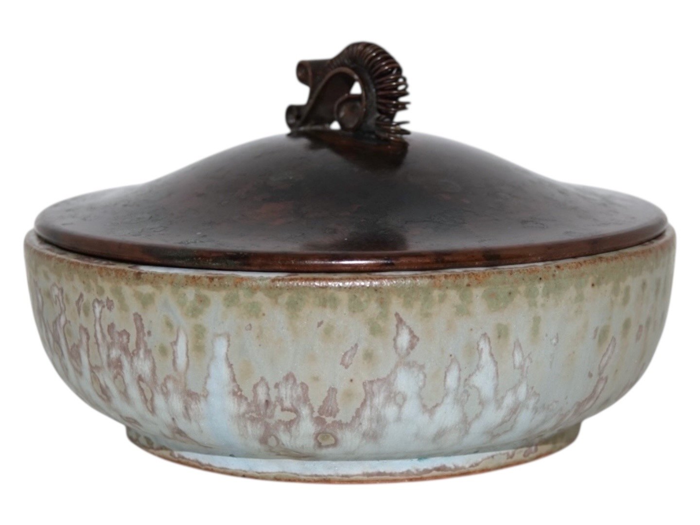 Arne Bang keramik, skål med en flot glasur samt originalt bronzelåg. Design nummer 183. Diameter 14,7 cm. Perfekt stand.