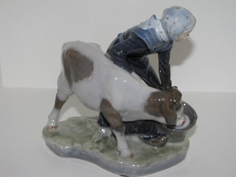 Royal Copenhagen Figur, Bondepige med kalv Af fabriksmærket ses det, at denne er produceret i 1965. Dekorationsnummer 779. 1. sortering. Højde 16 cm., længde 16 cm. Perfekt stand uden fejl.