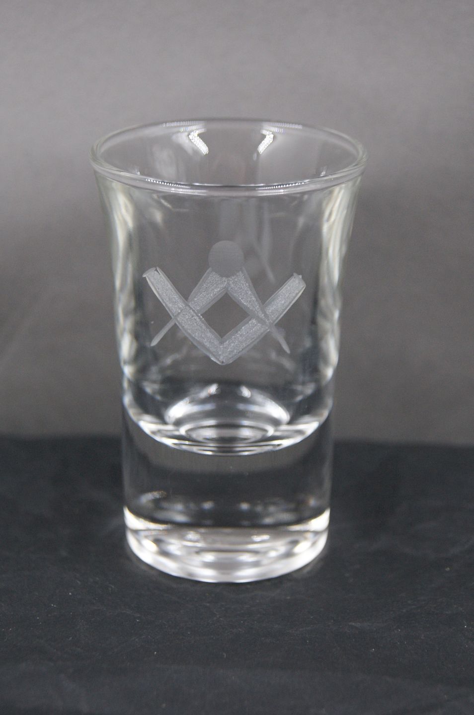 Danish Masonic glass or Freemason glass, schnapps glas engraved with freemason symbols on an edge-cutted foot.