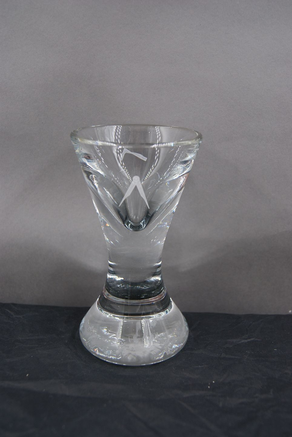 Danish Masonic glass or Freemason glass, drinking glass engraved with freemason symbols, on thick, round feet.
