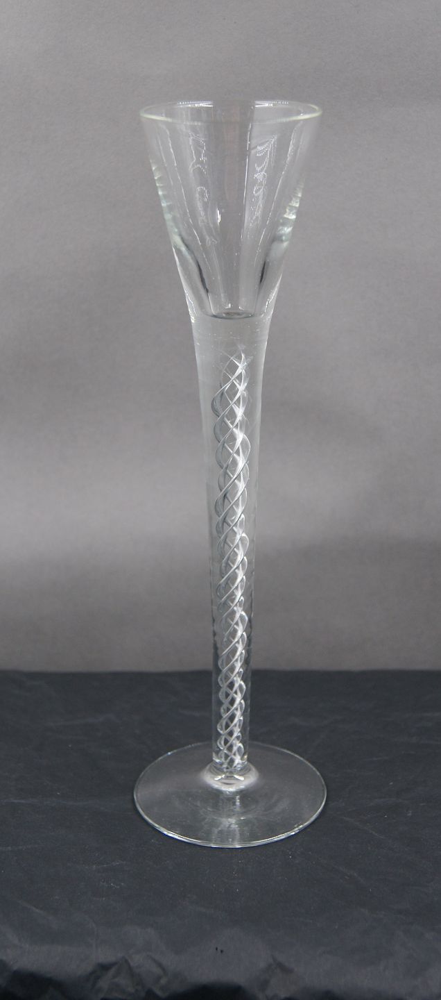 Schnapps Glass with internal air spiral and smooth cuppa on a tall stem. The glass is in good condition.