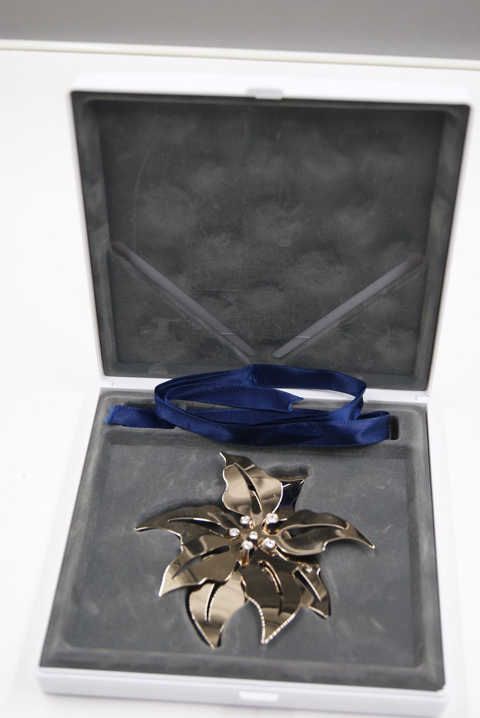 Georg Jensen Christmas Nordica julepynt juleuro 2001, designet af Regitze Overgaard, med originalt blåt bånd samt i hvid æske.
