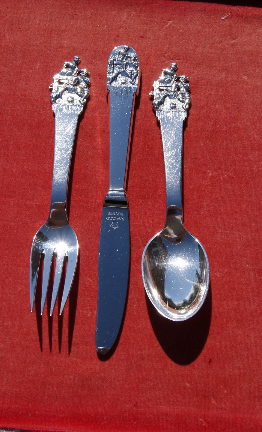 Sæt med barneske 14,8cm, barnekniv 17cm & barnegaffel 14,8cm i pæn brugt stand uden indgraveringer.