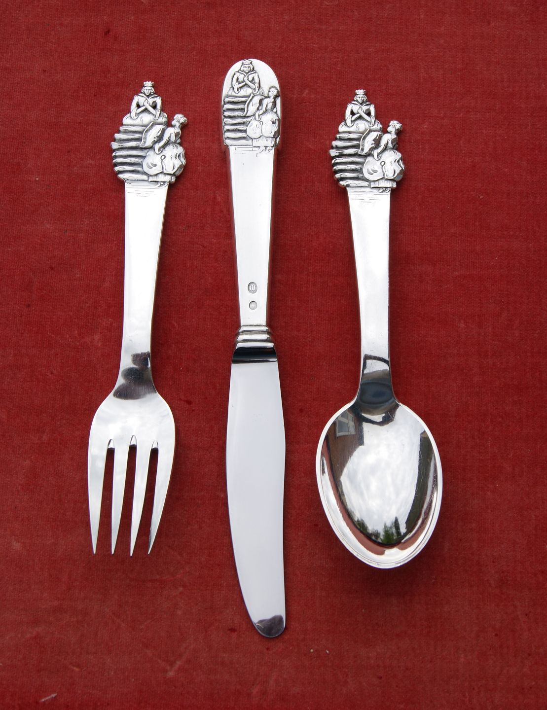 Sæt med barneske 14,8cm, barnekniv 17cm & barnegaffel 14,8cm i pæn brugt stand uden indgraveringer.